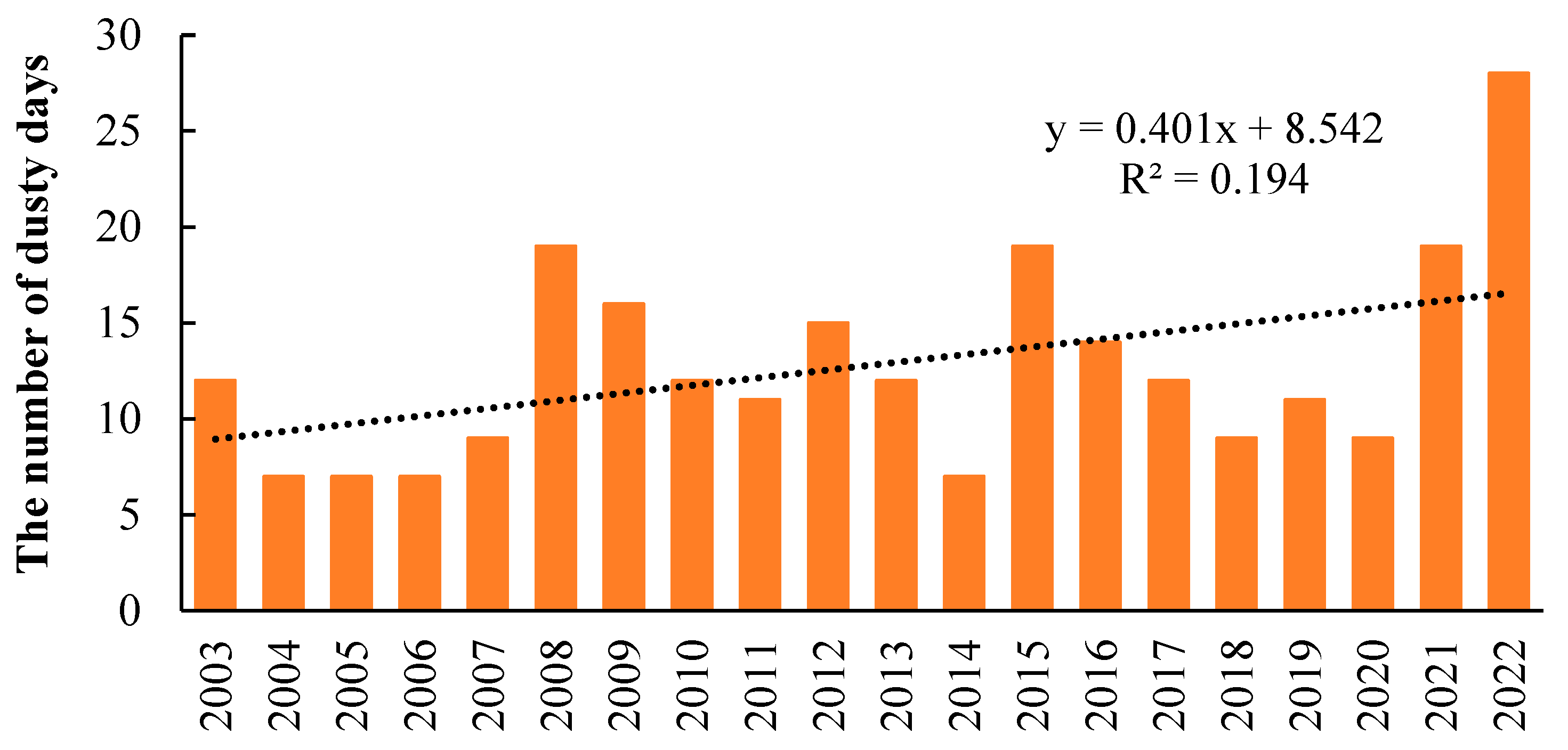 3.1. Spatiotemporal Variations of Dust Events Using Station Data
