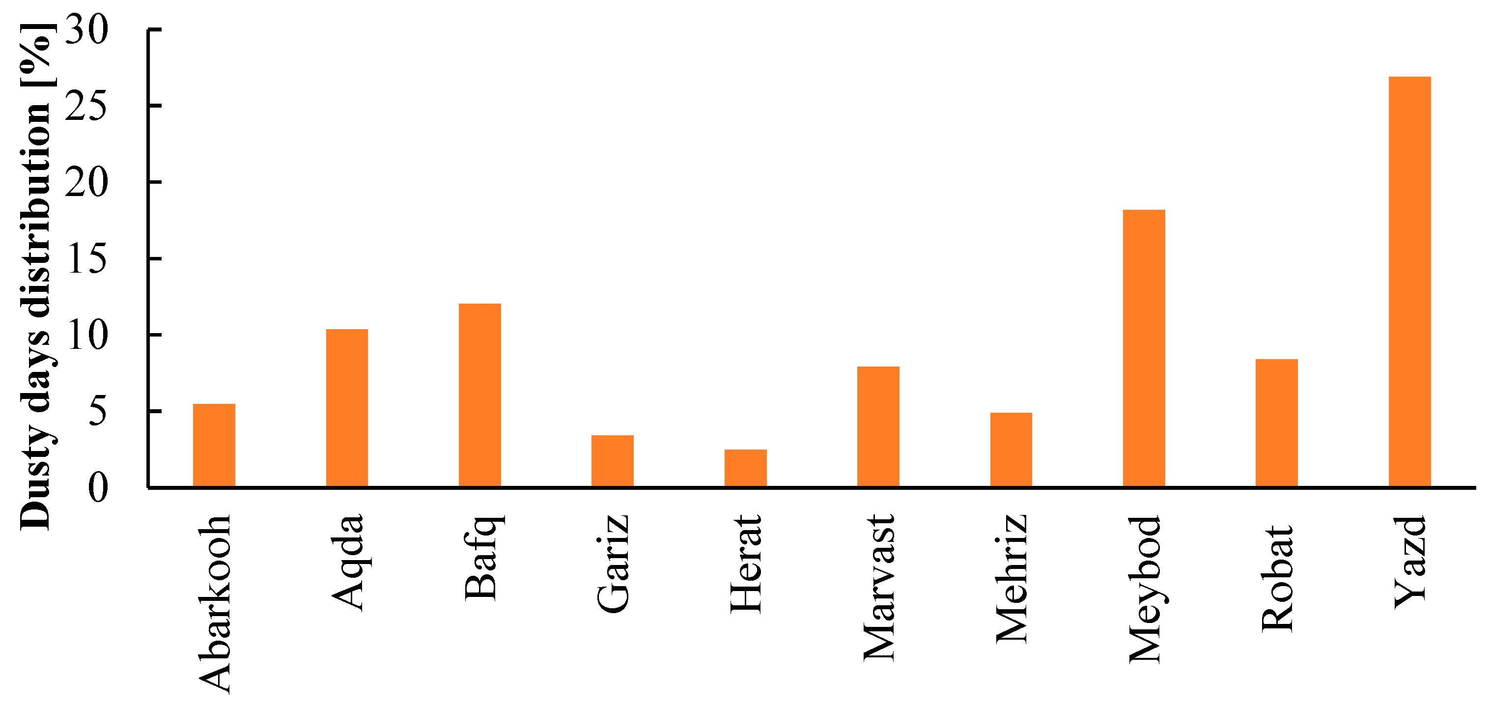 - Baghbanan, P.; Ghavidel, Y.; Farajzadeh, M. Temporal long-term variations in the occurrence of dust storm days in Iran. Meteorol. Atmos. Phys. 2020, 132, 885–898. [Google Scholar] [CrossRef]