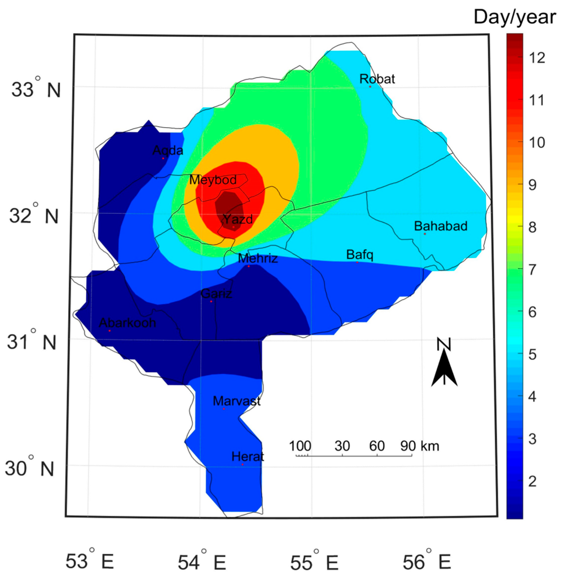 Spatial distribution of the mean annual number of dusty days (days/year) across Yazd province, averaged over the period 2003–2022.