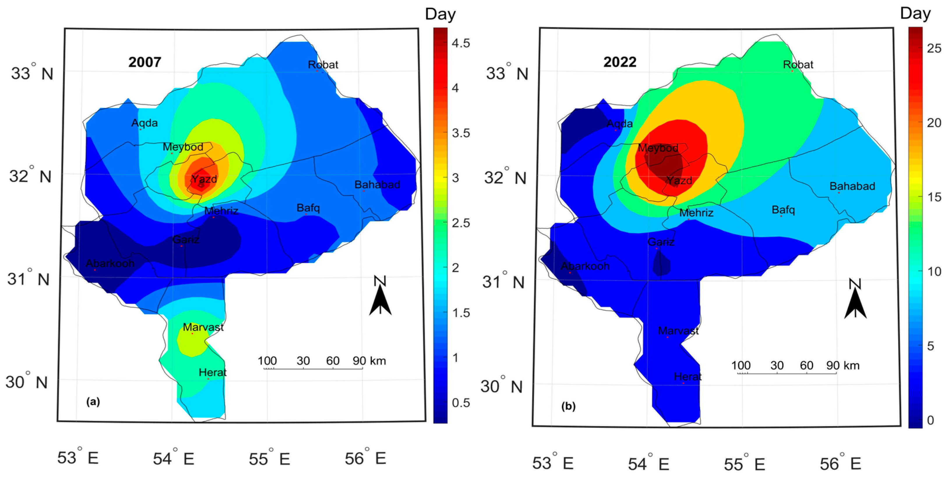Notably, the number of dusty days varied considerably between years, with the highest and one of the lowest frequencies recorded in 2022 and 2007, respectively (Figure 2). Therefore, the spatial distribution of dusty days in 2007 and 2022 is shown in Figure 6. In 2007, the frequency of dusty days was relatively low, with most areas experiencing fewer than 3 days annually. The central region, particularly around Yazd city and the vicinity of Meybod station, recorded the highest values, reaching up to 4.5 days per year, while the southern and western parts of the province (with Abarkouh, Marvast, and Herat stations) experienced only 1–2 dusty days annually. By contrast, the situation in 2022 shows a substantial intensification in dust activity. The central hotspot around Yazd and Meybod stations expanded significantly, with the number of dusty days exceeding 25 days per year. Surrounding areas, including surroundings of Bahabad, Mehriz, and Robat stations, experienced between 10 and 20 days annually, while the southern and southwestern parts of the province remained relatively less affected, with fewer than 7 dusty days. The spatial patterns for both years largely reflected the long-term mean distribution, although 2007 exhibited a slightly higher frequency of dusty days in the southern regions.