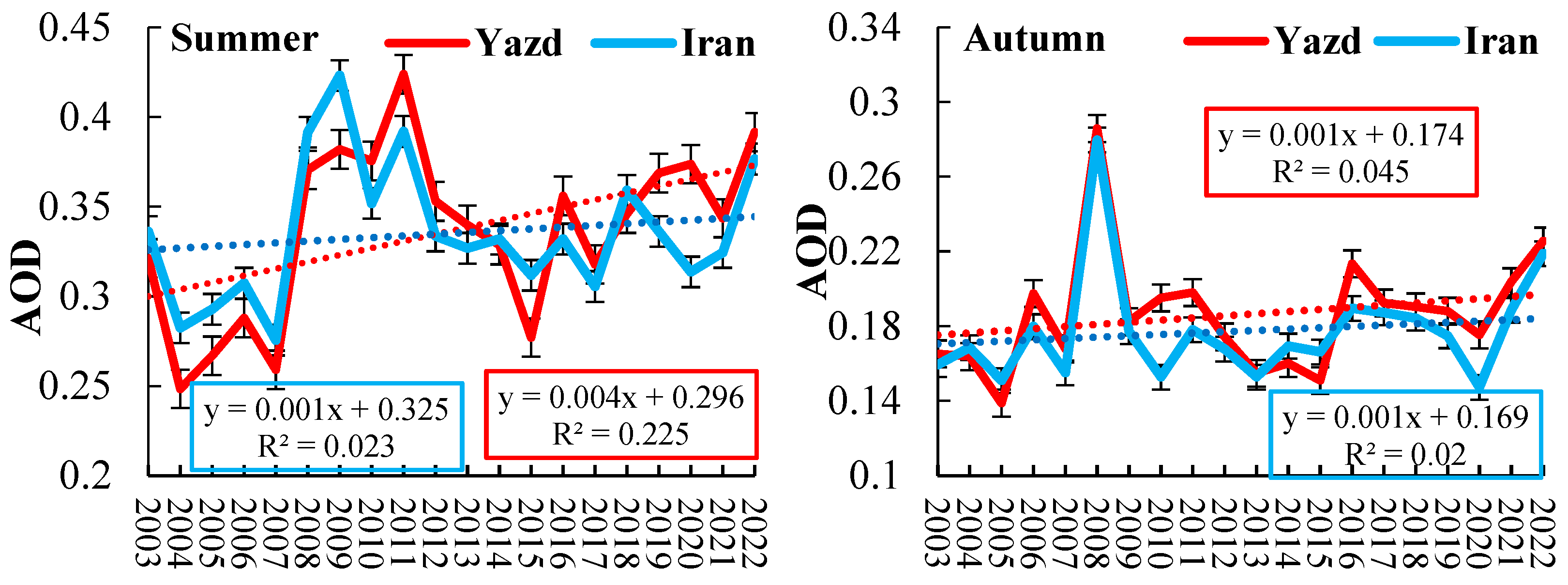 Figure 8 presents the seasonal variability and long-term trends of AOD in Yazd Province (red line) and Iran (blue line) from 2003 to 2022. The highest seasonal mean AOD values occur in spring (0.37) and summer (0.34), while winter and autumn exhibit lower values of 0.21 and 0.19, respectively. Peak spring AOD values in Yazd were observed in 2022 and 2012 (0.48 and 0.46), whereas summer peaks occurred in 2011 and 2022 (0.42 and 0.39). The long-term mean AOD in spring is higher in Yazd (0.37) than in Iran (0.34), while AOD values in other seasons are nearly identical. Trend analysis reveals steeper slopes in spring and summer, indicating a pronounced increase in aerosol loading during these seasons. In particular, Yazd exhibits a 2.4-fold greater slope in spring and a 3.8-fold greater slope in summer compared to the national average. This highlights Yazd’s higher sensitivity to seasonal variations and its greater susceptibility to dust events relative to other regions of the country.