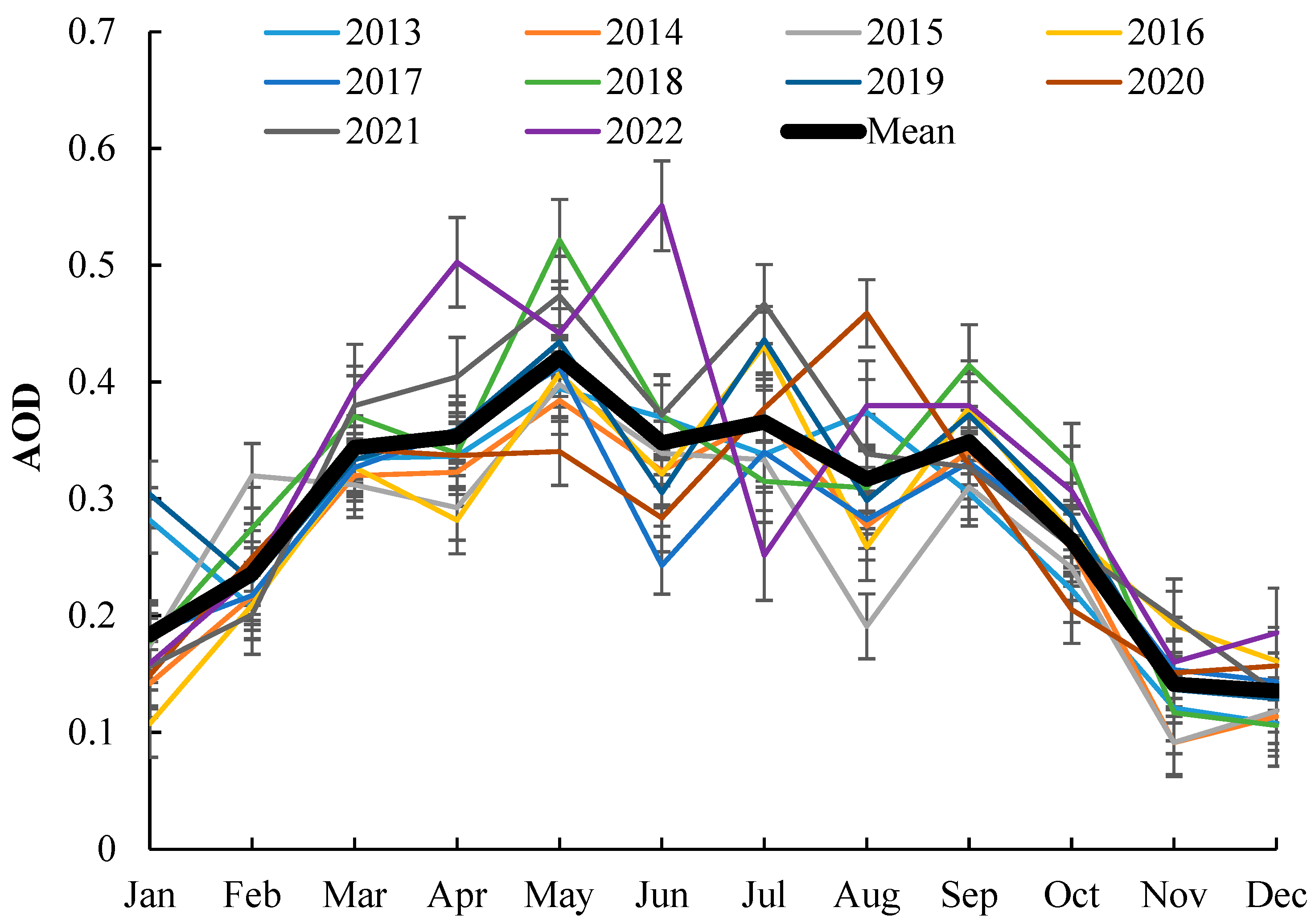 Figure 9 illustrates the monthly variations in aerosol optical depth (AOD) from 2013 to 2022. Except for the years 2016, 2020, and 2022, the highest AOD values were observed in May. For all years except 2022, AOD values decreased in June compared to May. The highest mean monthly AOD during this decade was recorded in June 2022, with a value of 0.55. According to the long-term mean monthly trend (solid black line), AOD values increase from January to May and decrease from September onwards, with the maximum observed in May and the minimum in December.