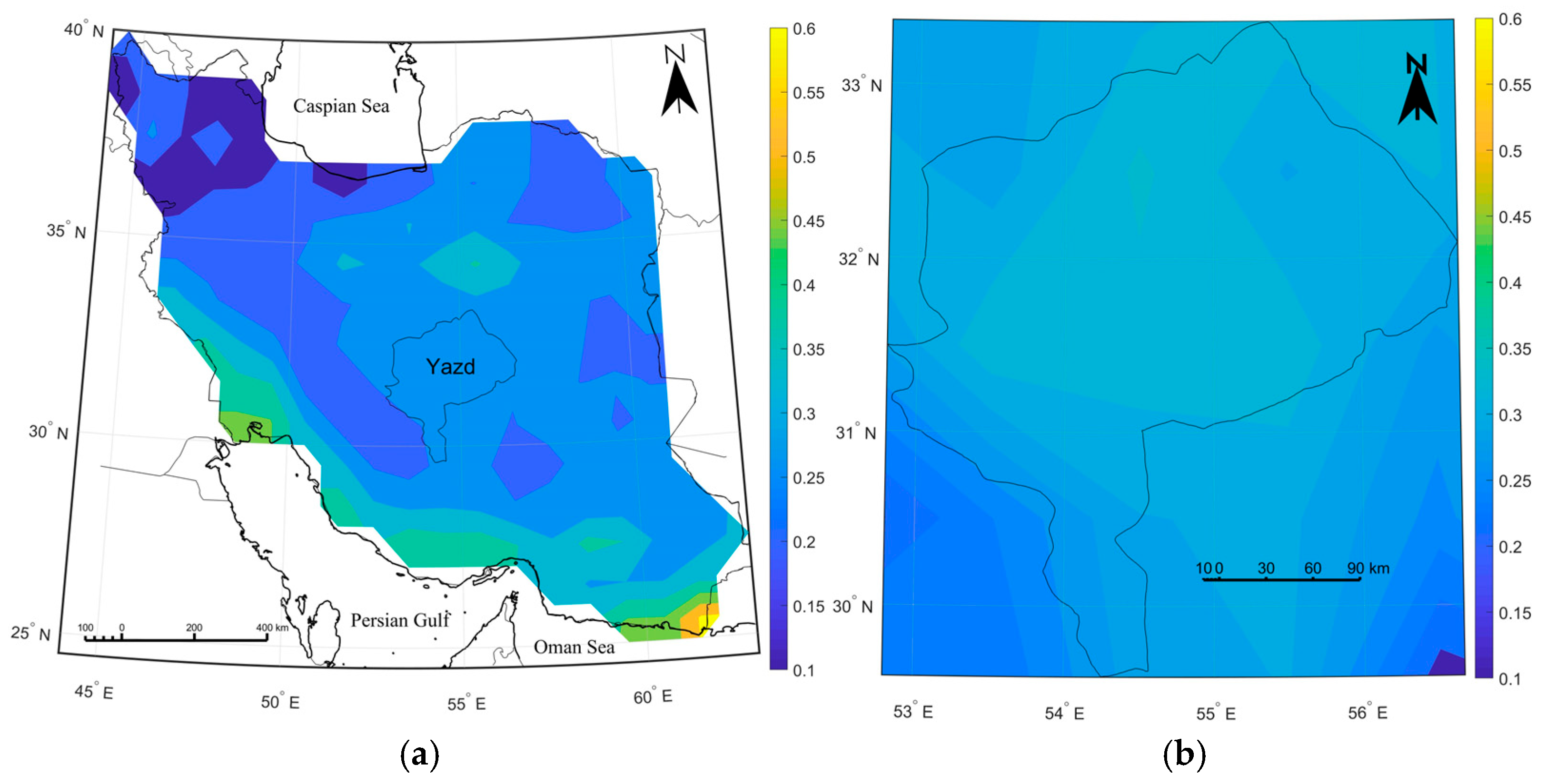Yazd Province, covering an area of 73,756 km2, is located in central Iran between latitudes 29°36′ and 33°24′ N, and longitudes 45°52′ and 56°42′ E. It accounts for about 5% of Iran’s total area. A large portion of the province consists of barren land and desert areas, representing over 19% of Iran’s desert regions. Mountainous areas are limited, with less than 2% of the province lying above 2500 m in elevation (Figure 1). Moreover, Yazd has the lowest annual rainfall in Iran, with significant spatial and temporal variations in precipitation. Climatically, most of the province is classified as arid or hyper-arid [32,60].
