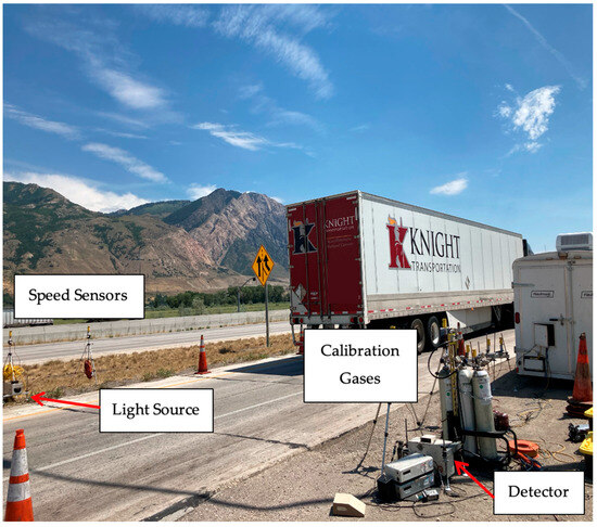 HD vehicle measurements were collected using the Fuel Efficiency Automobile Test (FEAT) remote sensing device, which was developed by researchers at the University of Denver [10]. FEAT has been shown to be a reliable and accurate system for measuring in-use emissions from both LD and HD vehicles [9,10,11,12,13]. While a detailed overview of FEAT measurement collection and operation can be found in Bishop and Stedman (1996) [14], the following paragraph summarizes its core operating principles and measurement procedures to provide context for this study. Figure 1 shows the FEAT system setup during the Perry 2023 campaign, with labels to highlight the primary operational components of the system.