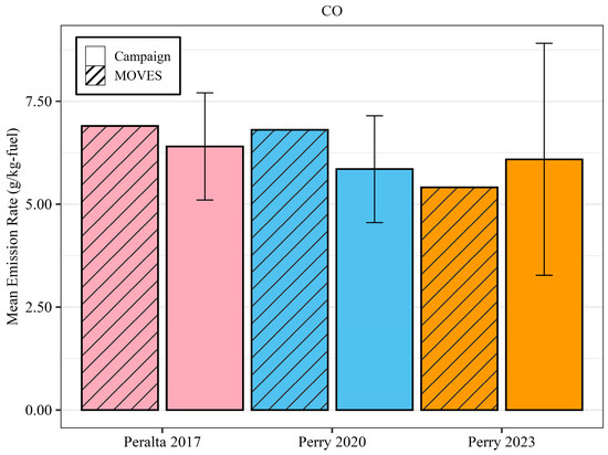 Figure 2. Fleet-wide CO emissions with MOVES5-estimated mean (striped) and measured mean (solid) for each campaign. Error bars are 95% CIs of the measured mean.
