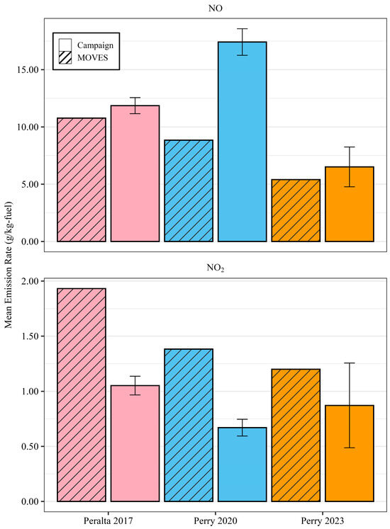 Figure 4. Fleet-wide NO (top) and NO2 (bottom) emissions with MOVES5-estimated mean (striped) and measured mean (solid) for each campaign. Error bars are 95% CIs of the measured mean.