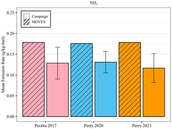 Figure 5 shows that MOVES5 consistently overestimates NH3 emissions for each campaign. MOVES5 overestimates mean NH3 emissions by 34% for both the Peralta 2017 and the Perry 2020 campaigns. For the Perry 2023 campaign, MOVES5 overestimates emissions by 38%. MOVES5 used HD diesel vehicle data from Preble et al. (2019) [28] to update NH3 emission rates, which were collected at the entrance to the Caldecott Tunnel and at the Port of Oakland near San Francisco. At the entrance to the Caldecott Tunnel, the vehicles are ascending a grade of 4% at average speeds of roughly 30 mph to 75 mph [28]. On-road measurement studies using portable emission measurement systems (PEMS) have shown that NH3 emissions from SCR-equipped trucks are emitted in short peaks when the exhaust temperature is high and during high-power transient engine operation when the exhaust temperature is sufficiently hot to inject urea [30,31]. The higher NH3 emission rates predicted by MOVES compared to this study could be due to the higher fuel-based NH3 emission rates measured at the Caldecott Tunnel due to higher load of the trucks at the Caldecott Tunnel.