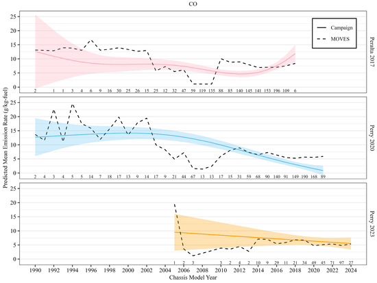 Figure 6. Trendline of average predicted CO emissions for each vehicle model year by campaign. Solid lines with shaded ribbon represent GAM-predicted mean and 95% CIs. Dashed black lines indicate average MOVES5-estimated mean for each vehicle model year.