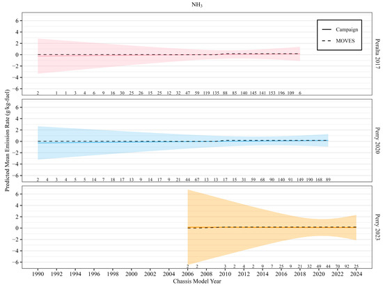 Figure 8. Trendline of average predicted NH3 emissions for each vehicle model year by campaign. Solid lines with shaded ribbon represent GAM-predicted mean and 95% CIs. Dashed black lines indicate average MOVES5-estimated mean for each vehicle model year. Numbers indicate the number of vehicle measurements in each model year.