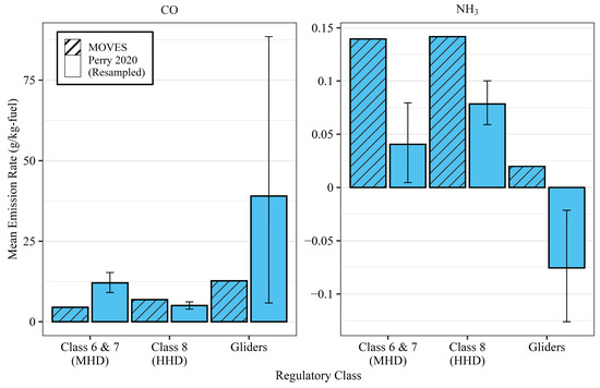 Figure 10. Mean resampled (solid) and MOVES5-estimated (striped) mean emissions for CO and NH3 by vehicle regulatory class, including Gliders. Error bars are 95% CIs of the resampled mean for each regulatory class grouping.