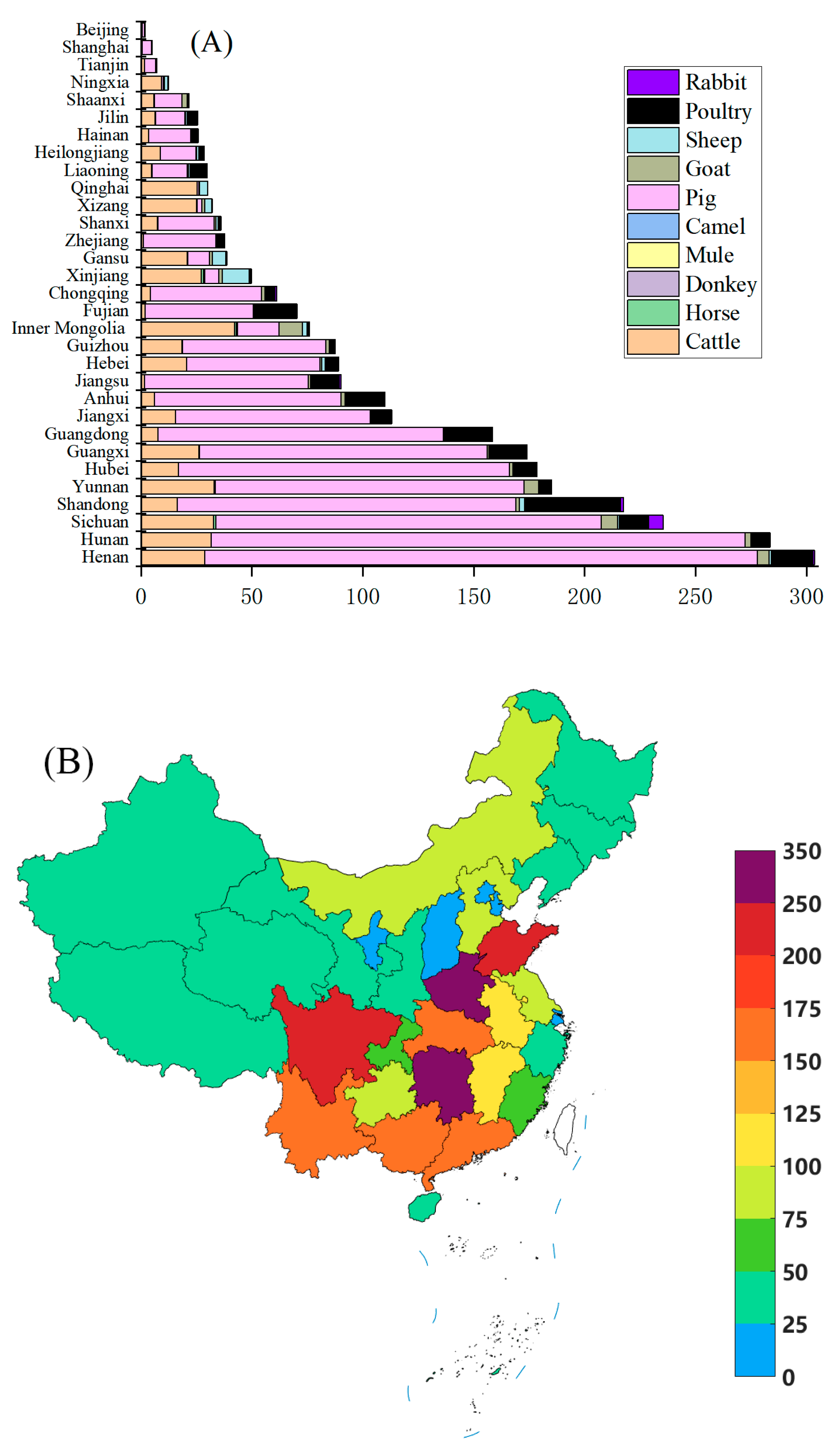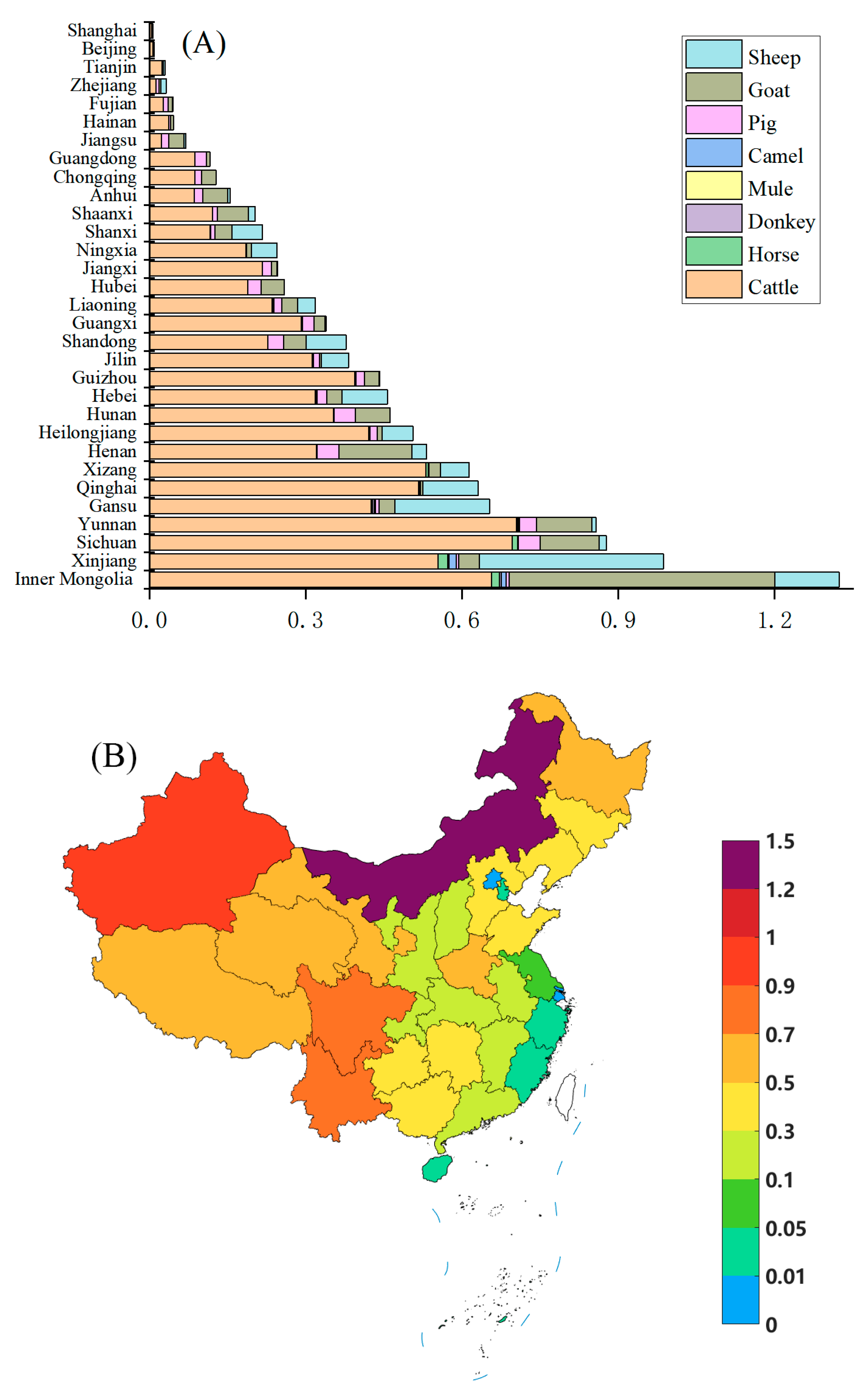 - Wang, Y.; Zhu, Z.; Dong, H.; Zhang, X.; Wang, S.; Gu, B. Mitigation potential of methane emissions in China’s livestock sector can reach one-third by 2030 at low cost. Nat. Food 2024, 5, 603–614. [Google Scholar] [CrossRef]