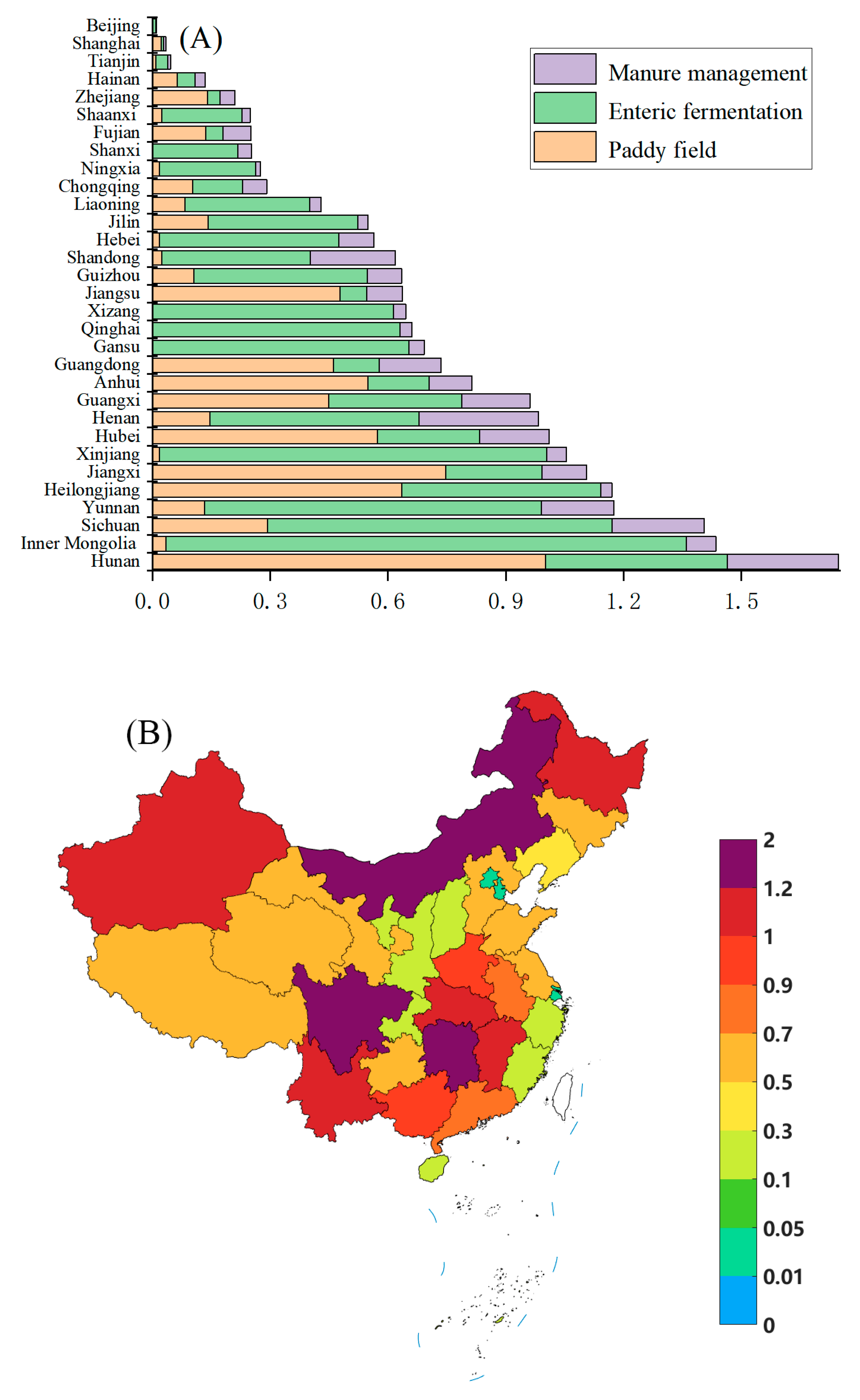 - Peng, S.; Piao, S.; Bousquet, P.; Ciais, P.; Li, B.; Lin, X.; Tao, S.; Wang, Z.; Zhang, Y.; Zhou, F. Inventory of anthropogenic methane emissions in mainland China from 1980 to 2010. Atmos. Chem. Phys. 2016, 16, 14545–14562. [Google Scholar] [CrossRef]