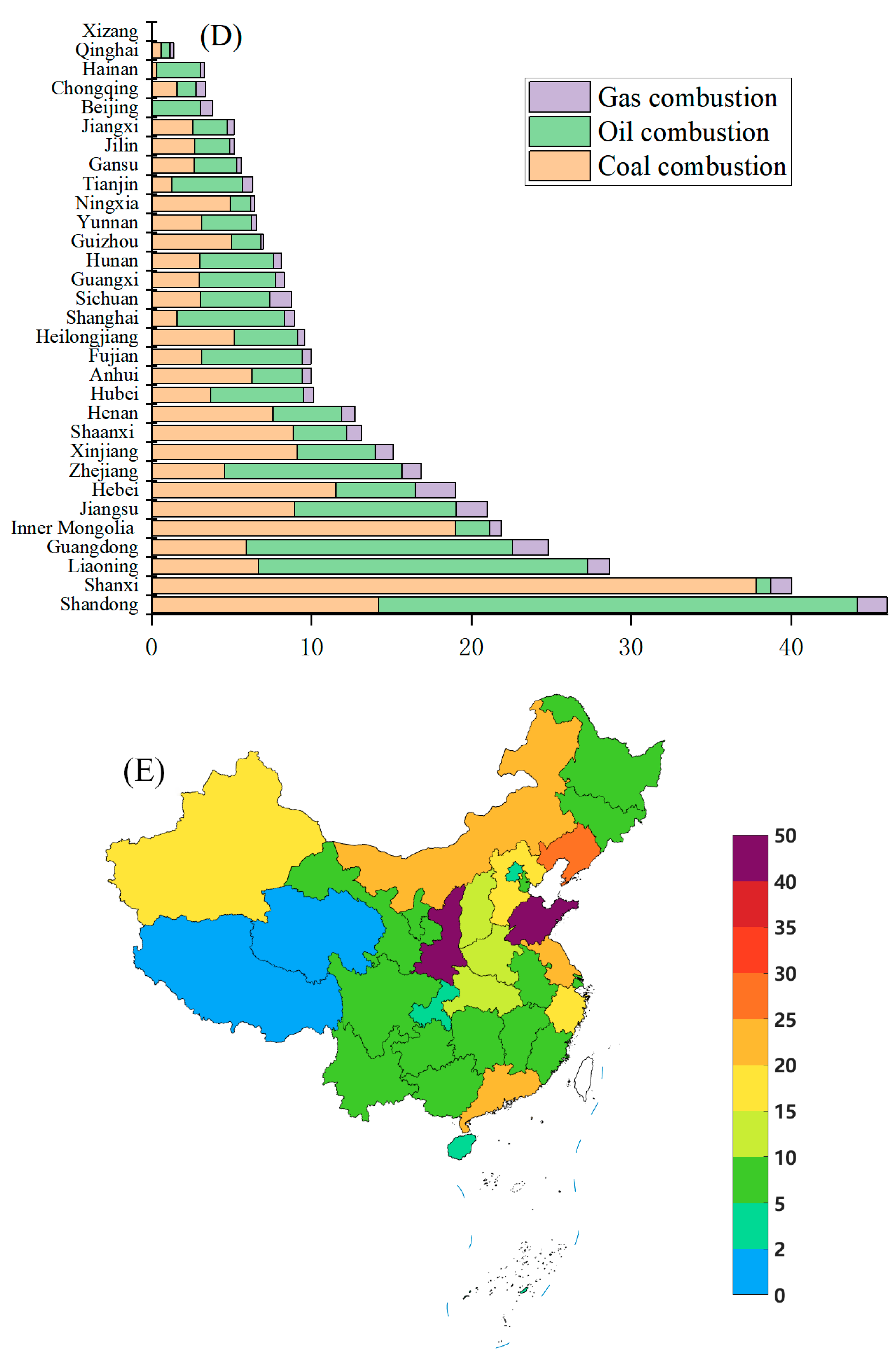 - Gao, Y.; Zhang, L.; Huang, A.; Kou, W.; Bo, X.; Cai, B.; Qu, J. Unveiling the spatial and sectoral characteristics of a high-resolution emission inventory of CO2 and air pollutants in China. Sci. Total Environ. 2022, 847, 157623. [Google Scholar] [CrossRef]