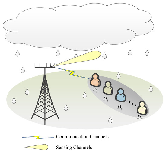 where c denotes the velocity of light, G denotes the antenna gain, is the distance between the BS and the rainfall area, is the transmitted power of the sensing signal, denotes the width of the transmitted pulse, and are the beam width of the main plane of the antenna pattern, respectively, and are the loss factor of the transmitter and receiver, respectively, is the frequency response loss factor of the receiver, and B denotes the bandwidth of the receiver. Here, Equation (23) represents a form of the weather radar equation tailored for rainfall estimation, where is the attenuation term of the signal, and , , and represent the attenuation coefficients of the atmosphere, sediments, and clouds, respectively.