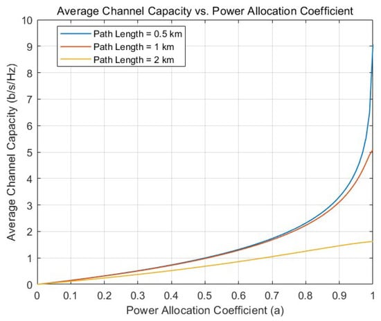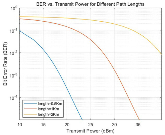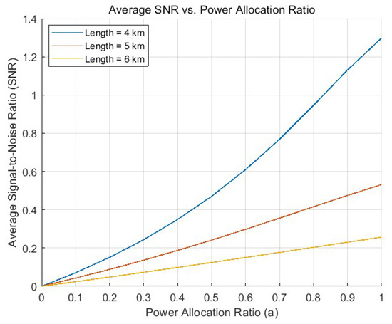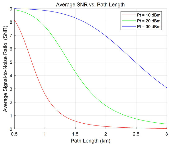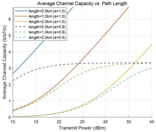 Figure 2 shows a schematic diagram of the average user SNR versus path length. Intuitively, as the path length increases, the received SNR at the user end decreases significantly due to the intensifying path loss over distance. Furthermore, when the transmitted power is 10 dBm and the distance between the BS and the user is 2.5 km, the user’s received SNR approaches zero, whereas increasing the transmit power leads to a noticeable improvement in the SNR at the user.