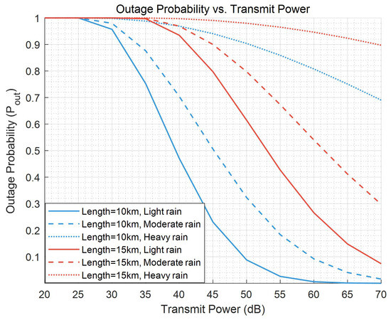 Figure 7 illustrates the user outage probability versus transmitted power. As can be seen from the Figure 7, as the rainfall increases, the outage performance of the users deteriorates. Furthermore, as observed from the figure, a shorter distance between the BS and the user leads to better outage performance. Additionally, comparison with Figure 6 reveals that although increasing the BS–user distance may improve outage performance under certain conditions, it results in a significant rise in the BER. Therefore, in practical ISAC scenarios, it is necessary to optimize the coverage of the ISAC base station to strike a balance between the user outage probability and BER performance. This finding highlights a critical design trade-off that must be considered by system engineers. The theoretical models derived in this paper enable the pre-deployment analysis of such trade-offs without the need for costly and time-consuming field trials in rain.