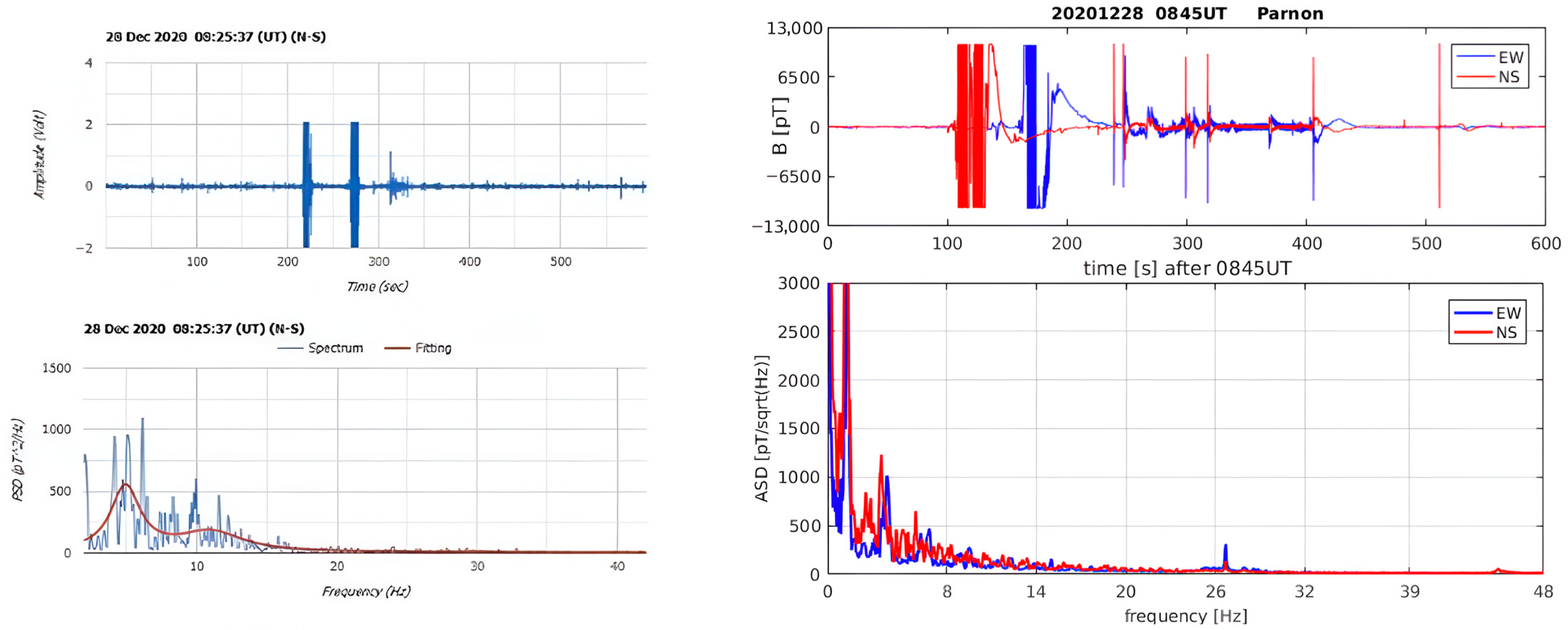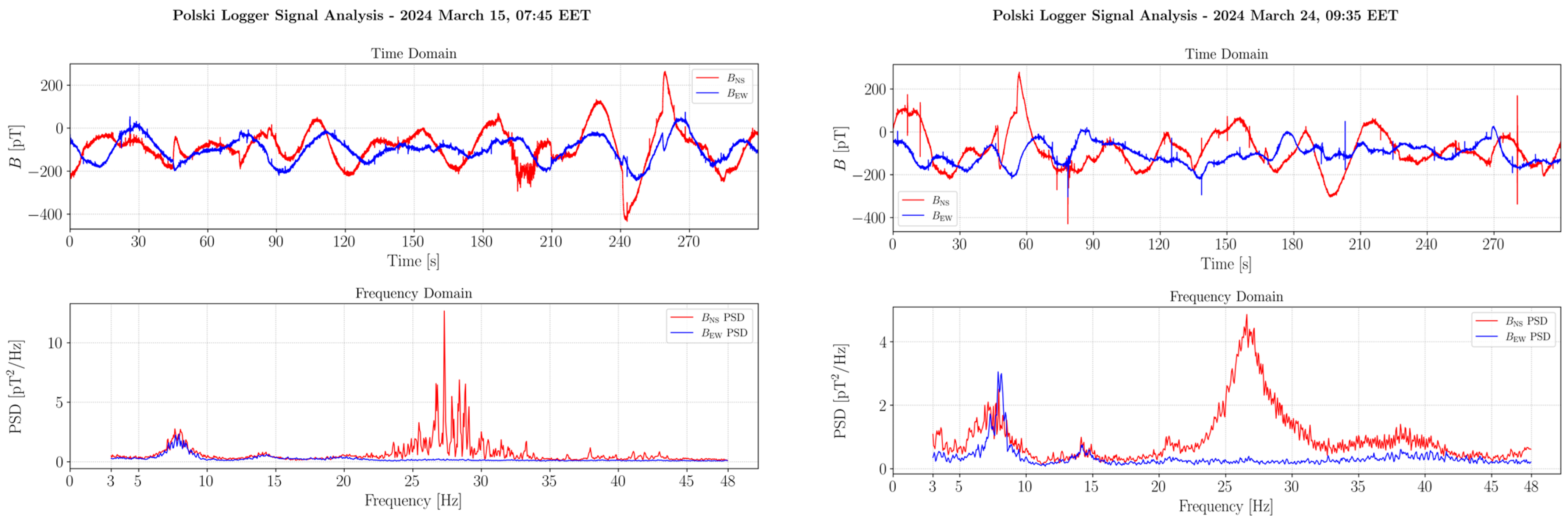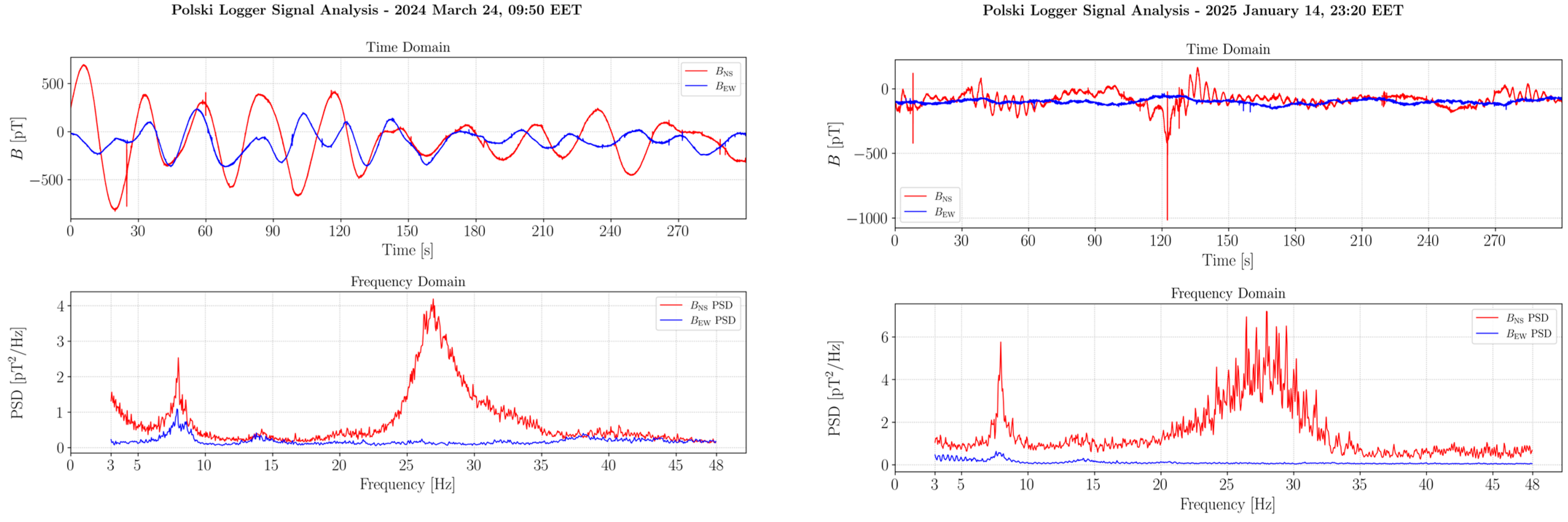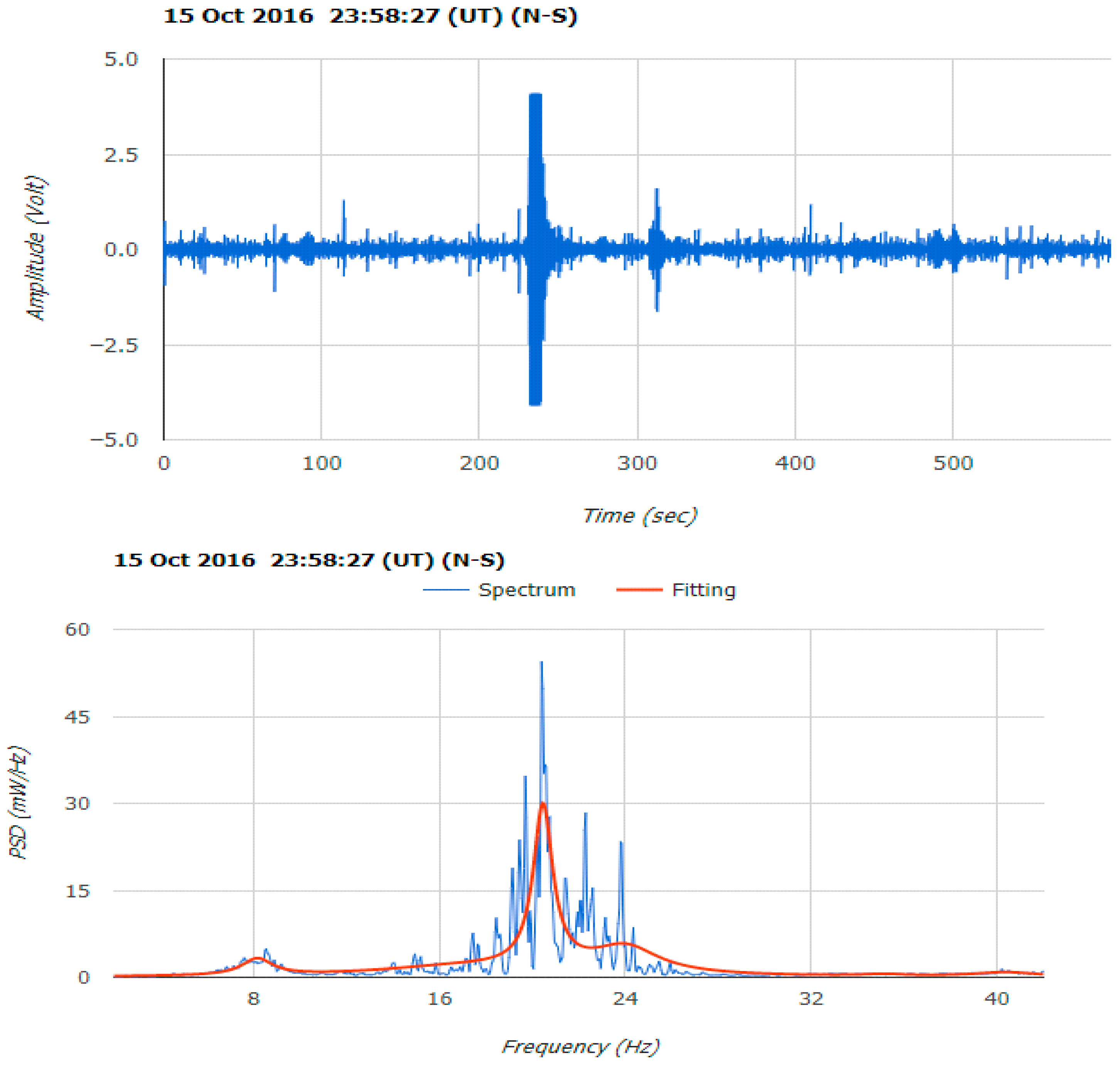 As is well known, SR signals are associated with various geophysical phenomena such as lightning, ionospheric disturbances, etc. In our case, the focus immediately turned to the potential connection between SR signals and seismic activity, due to Greece’s and the Eastern Mediterranean’s high seismicity. Interest in this topic was further intensified by a strong EQ that occurred very close to the Northern Station on October 15, 2016 just a few months after it became operational. The first such recording is shown in