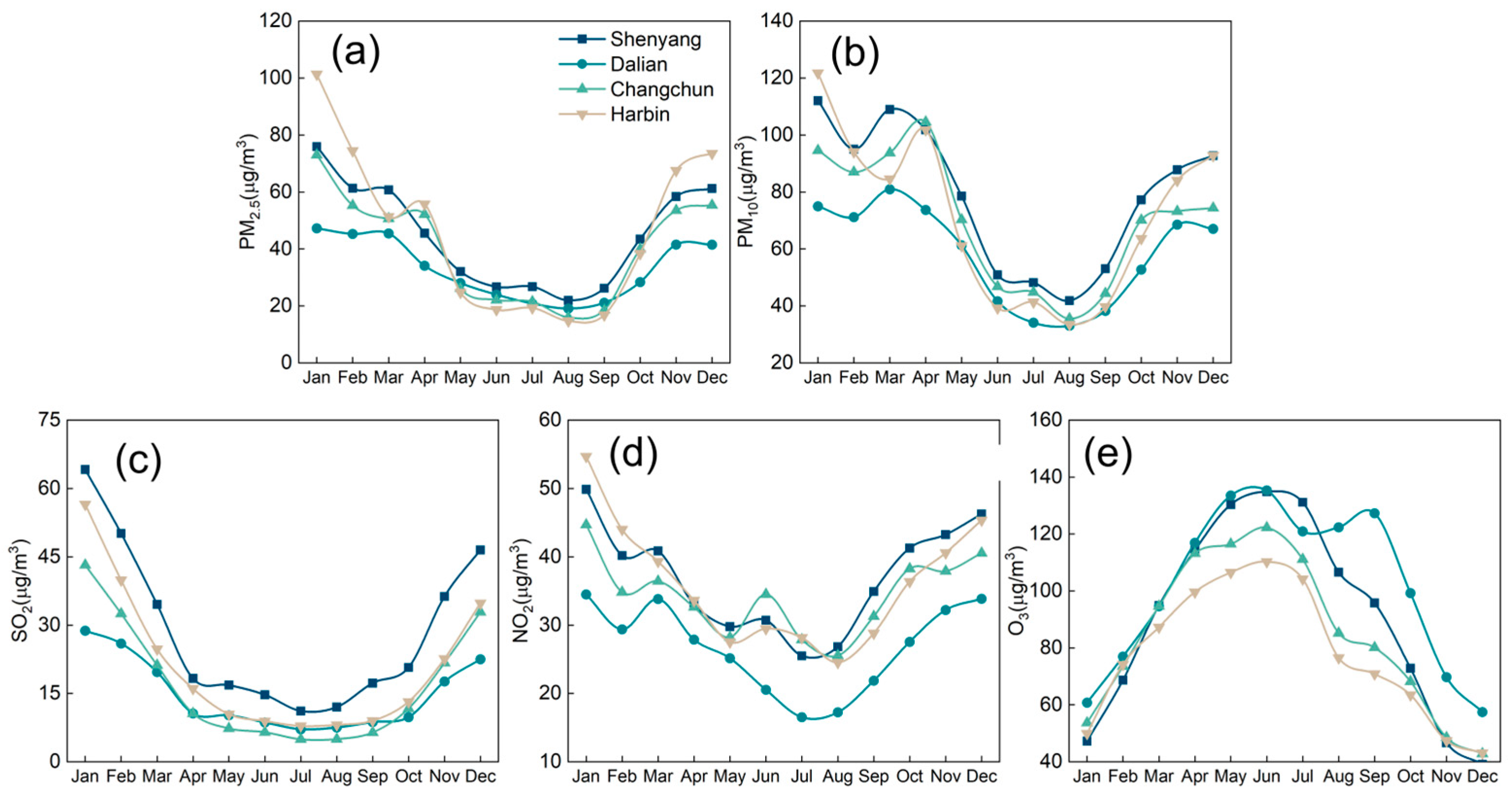 - Bai, L.; Li, C.; Yu, C.W.; He, Z. Air pollution and health risk assessment in Northeastern China: A case study of Jilin Province. Indoor Built Environ. 2021, 30, 1857–1874. [Google Scholar] [CrossRef]
