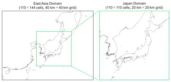 Figure 1 shows the computational domain used in this study. Calculations were first performed for the East Asia Domain, which covers East Asia at a horizontal grid size of 40 km, followed by calculations for the Japan Domain, which covers Japan at a horizontal grid size of 20 km. The initial and boundary conditions for the East Asia Domain were derived from the results of the global chemistry model CAM-Chem [28] under the 2015 conditions, whereas the Japan Domain uses the results of the East Asia Domain.