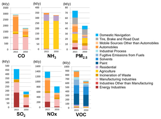 Emission data for 2050 in Japan were estimated based on Morikawa et al. (2021) [18]. It is assumed that atmospheric pollutant emissions from combustion sources (NOx, VOC, CO, NH3, PM2.5 and SO2) decrease in proportion to the CO2 reduction ratio from 2015 to 2050. Note that factors other than CO2 reduction rate, such as changes in type of fuel or exhaust gas treatment technologies, were not considered. CO2 reduction rate was estimated based on the Japanese government’s target, announced in 2018, of 80% reduction in greenhouse gas emissions. For stationary anthropogenic sources, emissions were estimated by applying changes in power generation and industrial activities and considering variations in electricity generation and fuel composition on those emissions in 2015. Vehicle emissions were estimated using JEI-VEM, considering the progress of vehicle electrification and the reduction in vehicle ownership. For anthropogenic emissions from areas other than Japan, the ECLIPSE V5a max technical feasible reduction scenario (MTFR) [31] was used. Emissions of biogenic VOC, open biomass burning, and volcanoes were assumed to remain unchanged from 2015. Figure 2 shows the anthropogenic emissions of atmospheric pollutants from Japan in 2015 and 2050.