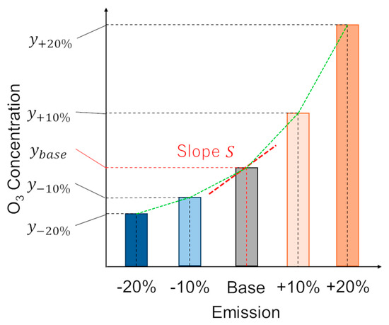 The sensitivity coefficients of O3 concentration to NOx and VOC emissions were calculated for both 2015 and 2050. Figure 3 illustrates the concept of the sensitivity coefficient used in this study.