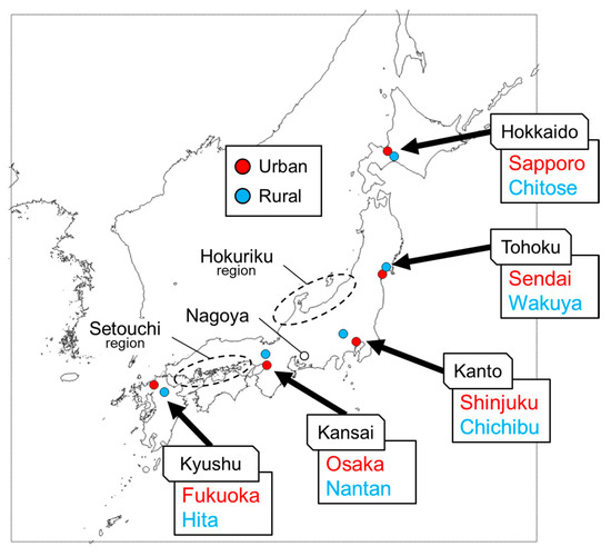 Sensitivity analysis was conducted for several representative locations across Japan. Figure 4 shows the locations at which sensitivity analysis was performed. First, five regions with different climates across the Japanese archipelago (Hokkaido, Tohoku, Kanto, Kansai, and Kyushu) were selected. Then, both an urban and a rural site were chosen within each region. In this study, the classification of “urban” or “rural” was determined based on population density data from the 2015 POPULATION AND HOUSEHOLDS OF JAPAN [35]. Cities with a population density lower than that of Shizuoka City—the least densely populated among the cities with populations of over 500,000, which are considered important in local governance in Japan (499.3 persons/km2)—were defined as “rural”, while those with a population density highest in each region, mostly higher than that of the least densely populated ward in the Tokyo 23 wards (5009.1 persons/km2) were defined as “urban.” This distinction is important because O3 formation processes are expected to differ between urban centers where anthropogenic emissions are concentrated, and rural areas where such emissions are relatively low. By comparing these two types of sites, differences in sensitivity between areas strongly affected by local emissions and those influenced by transported pollutants can be clearly identified.