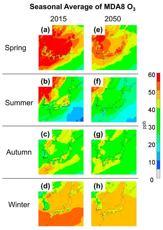 The calculation results of the seasonal average distribution of the daily maximum 8 h O3 concentration. (a) spring in 2015; (b) summer in 2015; (c) autumn in 2015; (d) winter in 2015; (e) spring in 2050; (f) summer in 2050; (g) autumn in 2050; (h) winter in 2050.