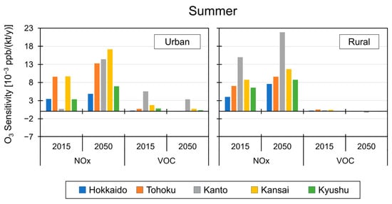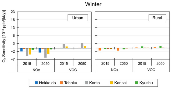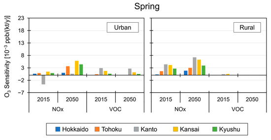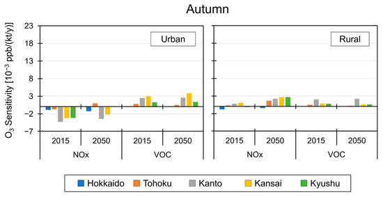 Figure 6, Figure 7, Figure 8 and Figure 9 show the results of the sensitivity analysis. As shown in Figure 6 and Figure 7, in both spring and summer, anthropogenic NOx emissions exhibited a positive sensitivity to O3 concentrations, with a greater magnitude than that in 2015. This indicates that in spring and summer, reductions in NOx emissions become more effective at lowering O3 concentrations in 2050 compared to 2015. According to the result of sensitivity analysis, the magnitude of this increase in effectiveness ranges from −0.18 (which means the place where NOx reduction was counterproductive in 2015 become effective in 2050) to 4.93 times in urban areas and 1.45 to 5.69 times in rural areas during spring, and from 1.39 to 19.48 times in urban areas and 1.33 to 1.89 times in rural areas during summer, relative to 2015. Sensitivity to anthropogenic VOC emissions in rural areas during spring and summer was negligible in both 2015 and 2050. This indicates that reductions in anthropogenic VOC emissions contribute little to lowering O3 concentrations in these periods in rural areas. In the urban areas of Kanto and Kansai, VOC sensitivity was slightly positive, indicating that VOC reductions had some effect on lowering O3 concentrations. However, effectiveness decreased from 2015 to 2050, with spring values ranging from 0.68 to 0.93 times and summer values from 0.42 to 0.60 times, suggesting that by 2050, VOC emission reductions will become less effective in lowering O3 concentrations in urban areas. Figure 8 and Figure 9 show that, in autumn and winter, urban areas exhibited little to no sensitivity or negative sensitivity to anthropogenic NOₓ emissions, whereas rural areas showed almost no sensitivity, while both urban and rural areas showed little positive or no sensitivity anthropogenic VOC emissions. Sensitivity in autumn and winter does not change significantly between 2015 and 2050. In colder seasons, photochemical O3 formation is not active, whereas the titration effect is present, which is thought to account for this characteristic. Results for autumn and winter indicate that O3 increases with NOx reductions in autumn and winter; however, since these are not seasons when high concentrations typically occur, it is not considered a major issue.