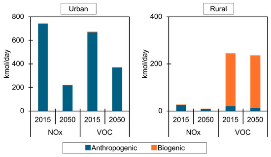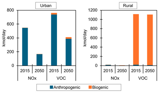 The reason for the changes in O3 sensitivity during spring and summer from 2015 to 2050 was investigated. In this section, firstly particular attention is given to the Kanto region, where the sensitivity in the urban core showed the most significant variations. Since O3 sensitivity to NOx and VOC depends on the balance between their respective emissions, NOx and VOC emissions in both urban and rural areas of Kanto were analyzed. Figure 10 shows NOx and VOC emissions in spring. In the urban area, the ratio between NOx and VOC (NOx/VOC) changes from 1.1 in 2015 to 0.59 in 2050; the relative dominance between NOx and VOC emissions reversed. In contrast, in the rural area, since anthropogenic emissions are relatively small and biogenic VOC (BVOC) account for the majority of total VOC emissions with a large amount, NOx/VOC does not change significantly: it changed from 0.11 in 2015 to 0.04 in 2050. As the NOx/VOC ratio decreases, the sensitivity to NOx becomes more positive. Therefore, the changes in the emission balance observed here are consistent with the trends in sensitivity changes found in this study. Figure 11 shows NOx and VOC emissions in summer and indicates that a conclusion similar to that for spring can also be drawn for summer. In the urban area, NOx/VOC changes from 0.72 in 2015 to 0.41 in 2050. In contrast, in the rural area, NOx/VOC does not change significantly: it changed from 0.02 in 2015 to 0.01 in 2050. Although the relative dominance between NOx and VOC emissions did not reverse in the urban area in summer, VOC emissions became relatively higher, which could cause the NOx sensitivity to increase more positively. For reference, emissions at other locations are shown in Figures S11–S18. A mechanism similar to that observed in the Kanto region was also seen in Hokkaido, Tohoku, and Kansai; since reduction in anthropogenic NOx emissions is relatively larger than anthropogenic VOC emissions, NOx/VOC ratio shifts low and leads to NOx-limited conditions. In Kyushu region, BVOC showed a noticeable influence even in the urban area, and NOx-limited conditions are likely governed by a combination of changes in anthropogenic emissions and the effects of BVOC. In all regions, the large contribution of BVOC relative to anthropogenic emissions maintains NOx-limited conditions from 2015 to 2050 in rural areas.