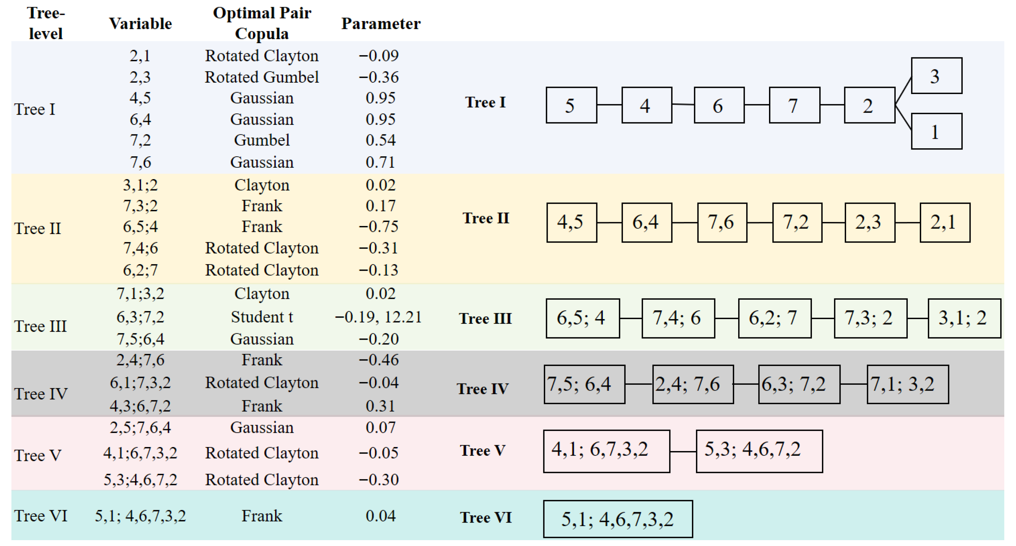 | 6-1 dimensional variables | R-Vine | 0.0423 | 0.9325 | 0.9103 | 0.9205 | −10,901.18 | −10,832.24 |