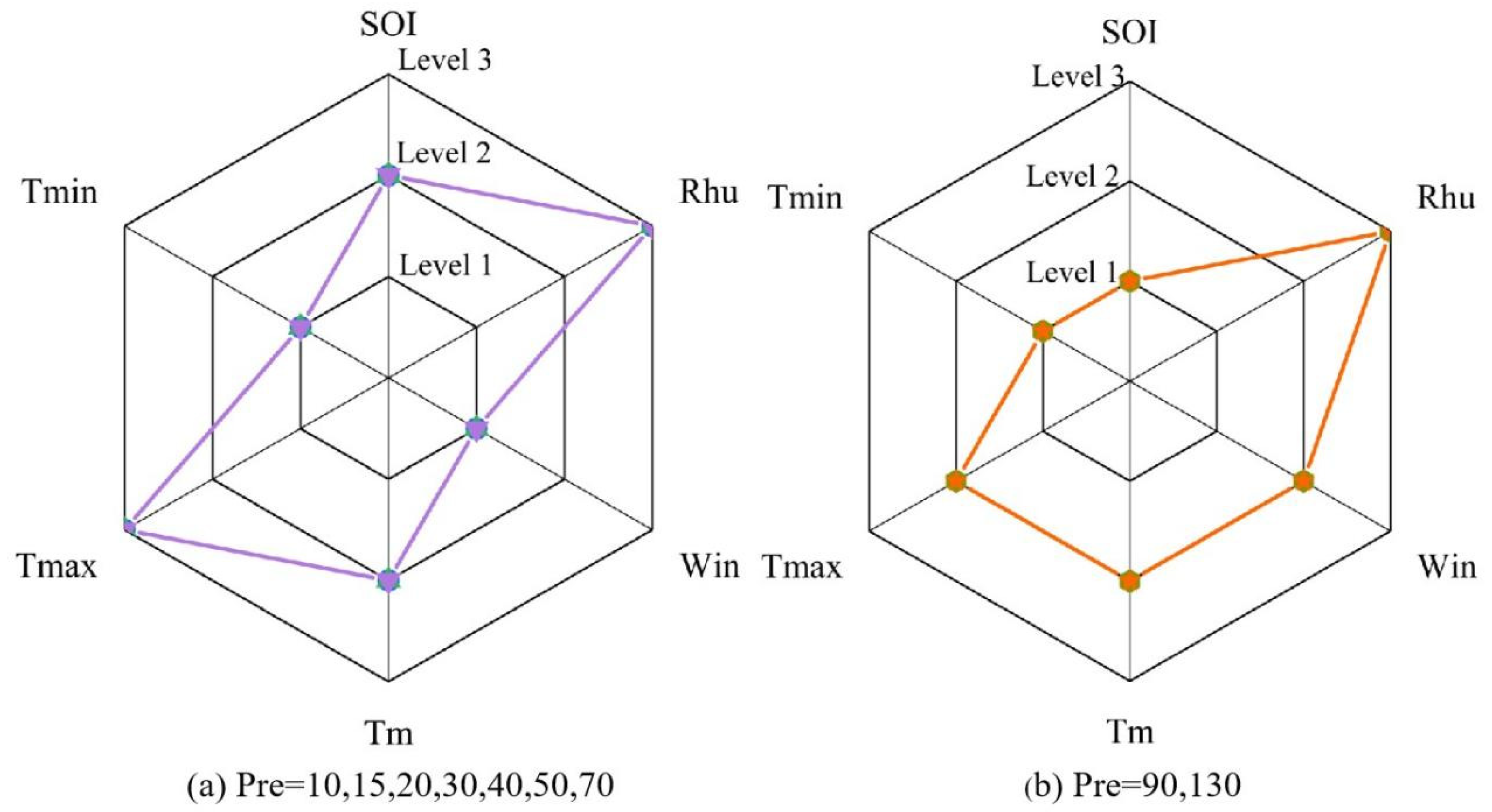 - Tmin, Win, and Tmax exhibit greater sensitivity to variations in precipitation levels in the Huang-Huai-Hai region. As precipitation increases, the influence of Rhu on the multivariate joint distribution intensifies. Higher values of Rhu and Tmax correspond to better CDF values in the multivariate joint distribution. Additionally, higher precipitation values lead to increased SOI values, which in turn result in higher CDF values for the multivariate joint distribution.