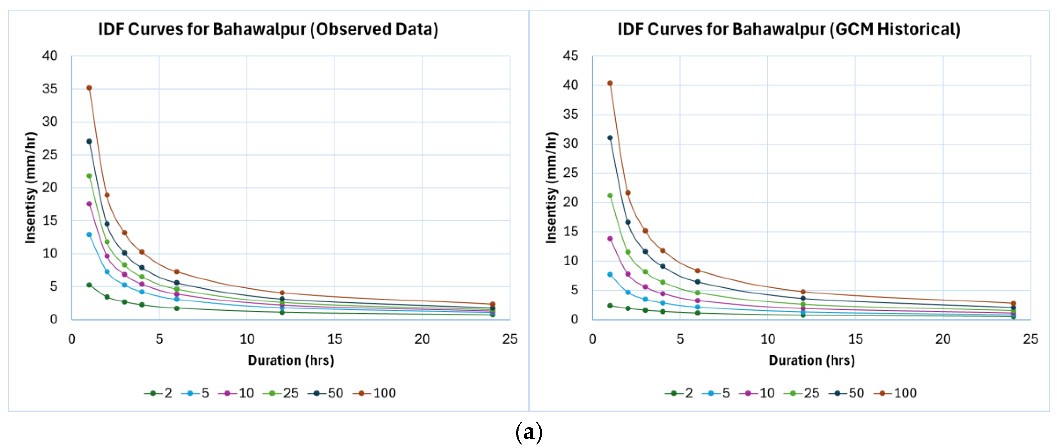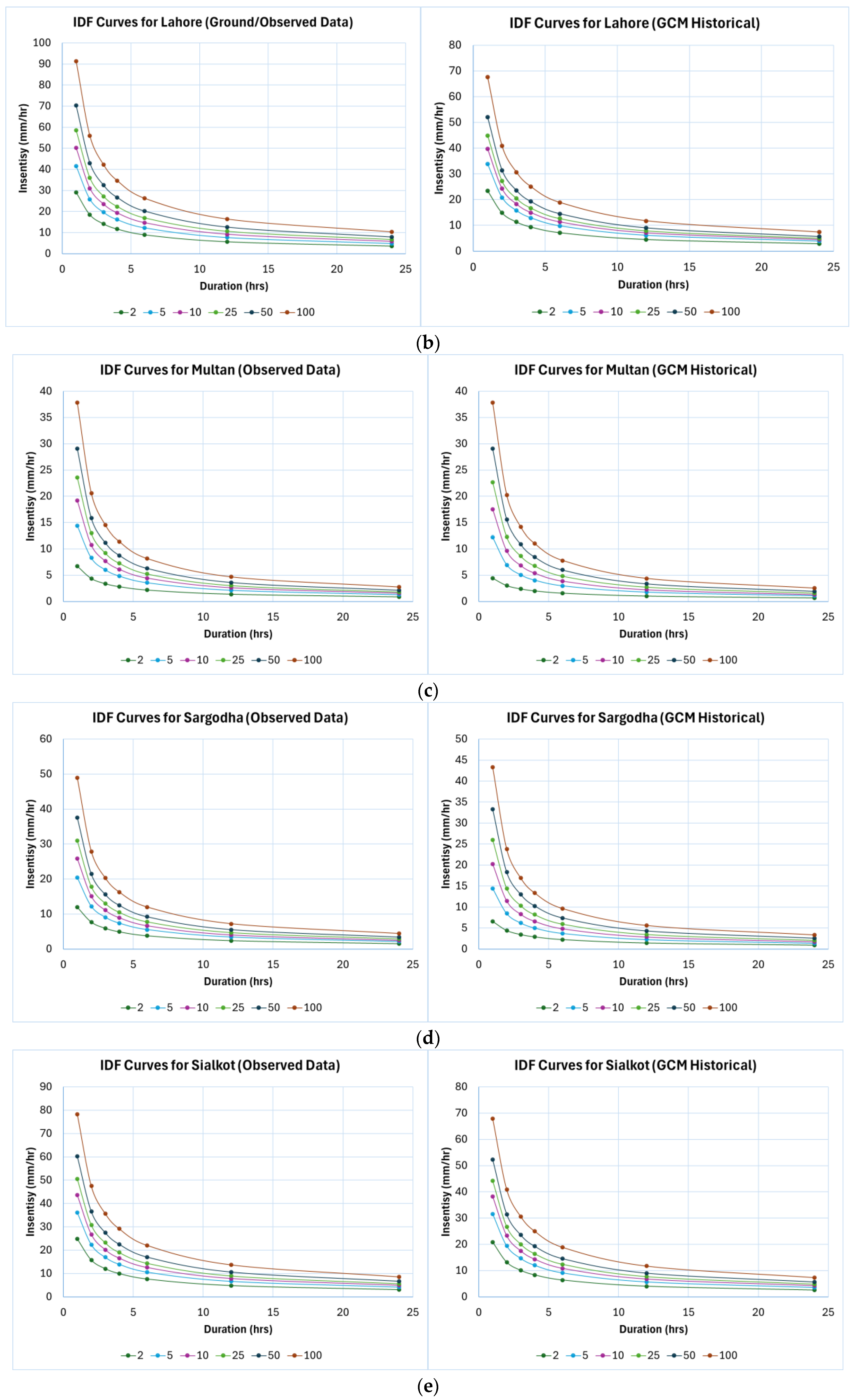 - Under SSP5-8.5, future projections show a larger increase, with Bahawalpur’s 50-year return period intensity rising by 111.39%, and Lahore’s by 51.56%.