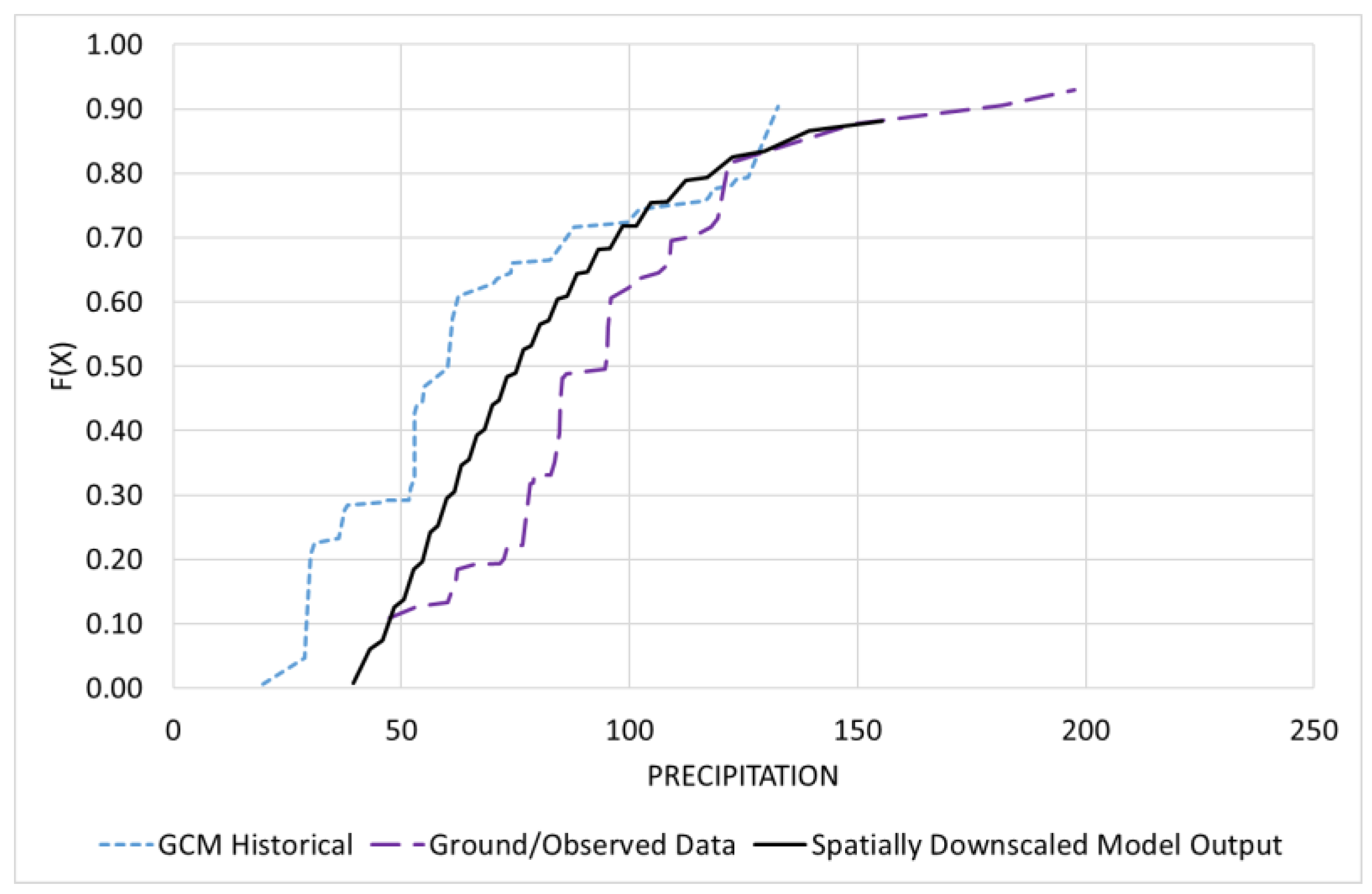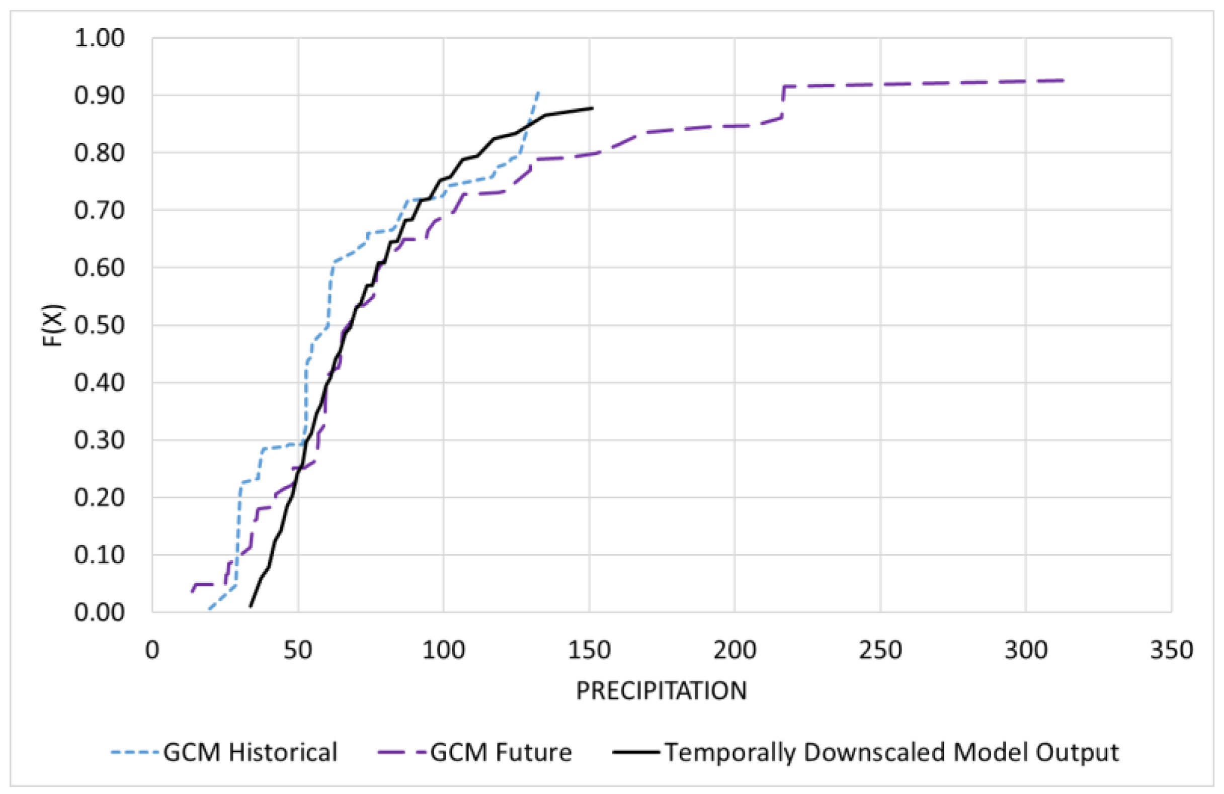 - With a similar approach, model the variation between the scenario-based future GCM dataset and the historical GCM-simulated dataset using the quantile mapping methodology, which helps extract the downscaled scenario-based future GCM projections, for the dataset. This is known as temporal downscaling of future GCM projections to the baseline historical GCM rainfall dataset:where is the temporally downscaled dataset for the future GCM projections and the historical GCM simulated dataset for the corresponding period.