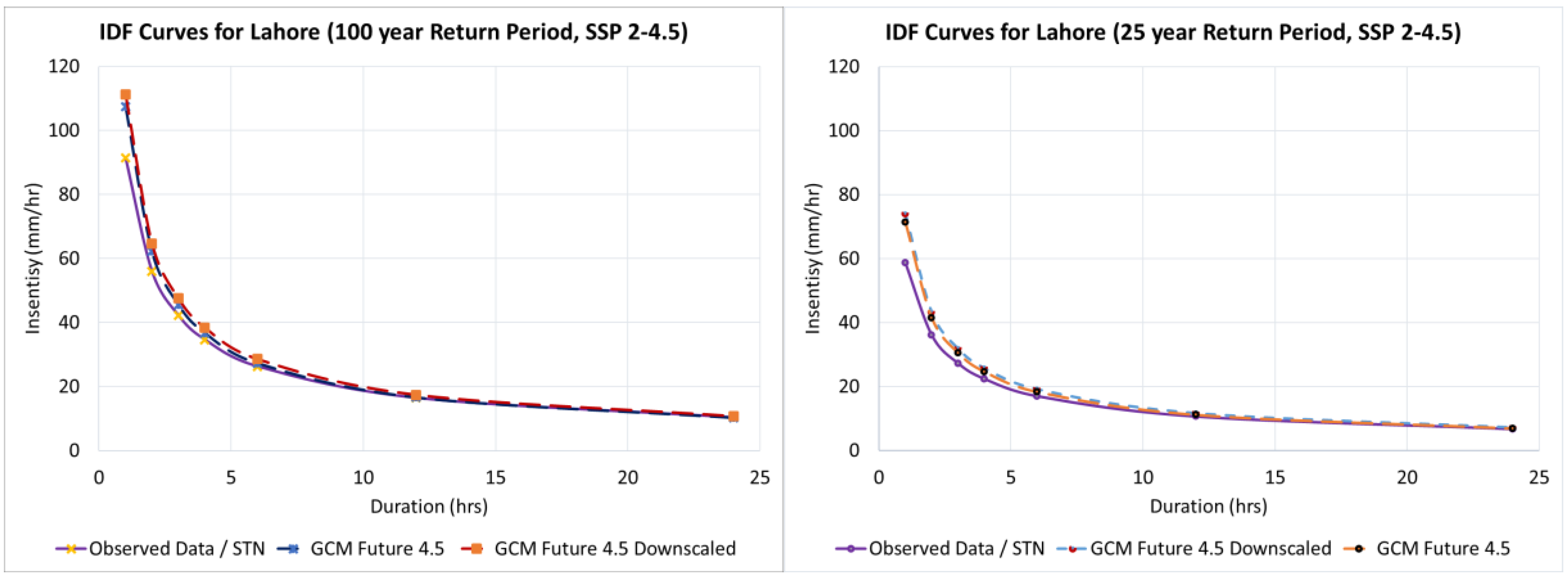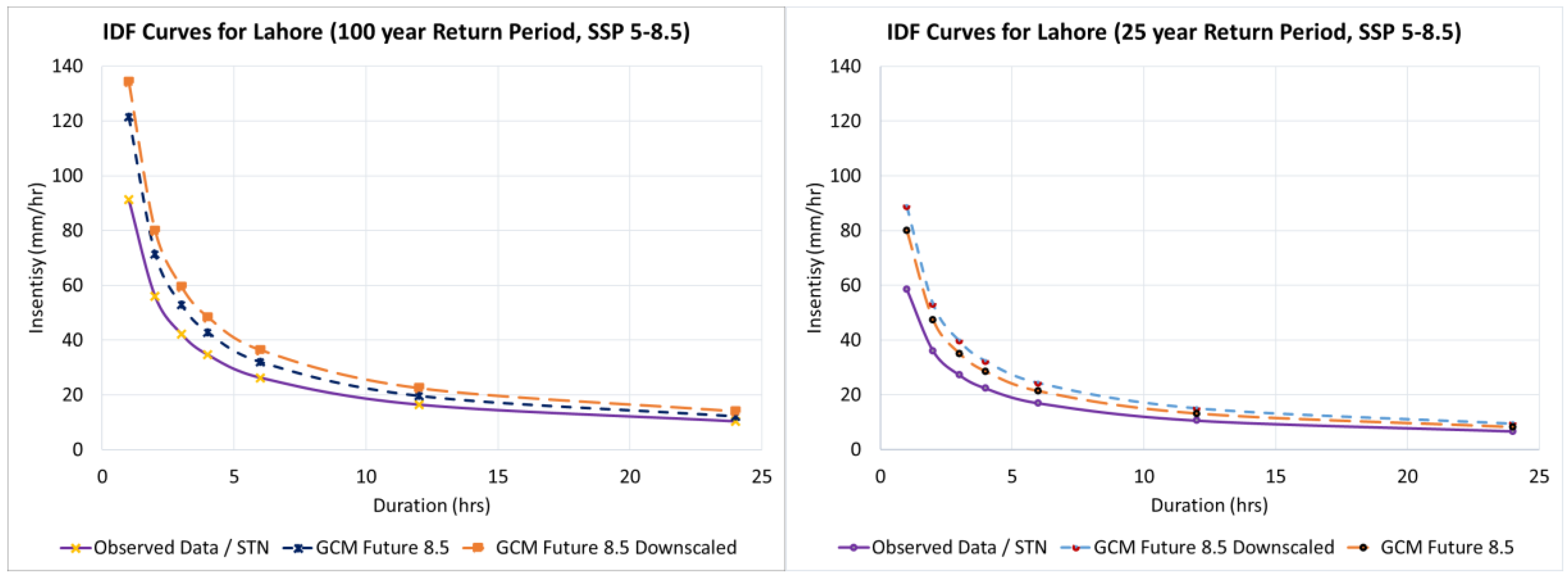 - The downscaling process significantly affected future projections, especially for extreme return periods; for Lahore, the 100-year intensity increased by about 10% under SSP5-8.5.