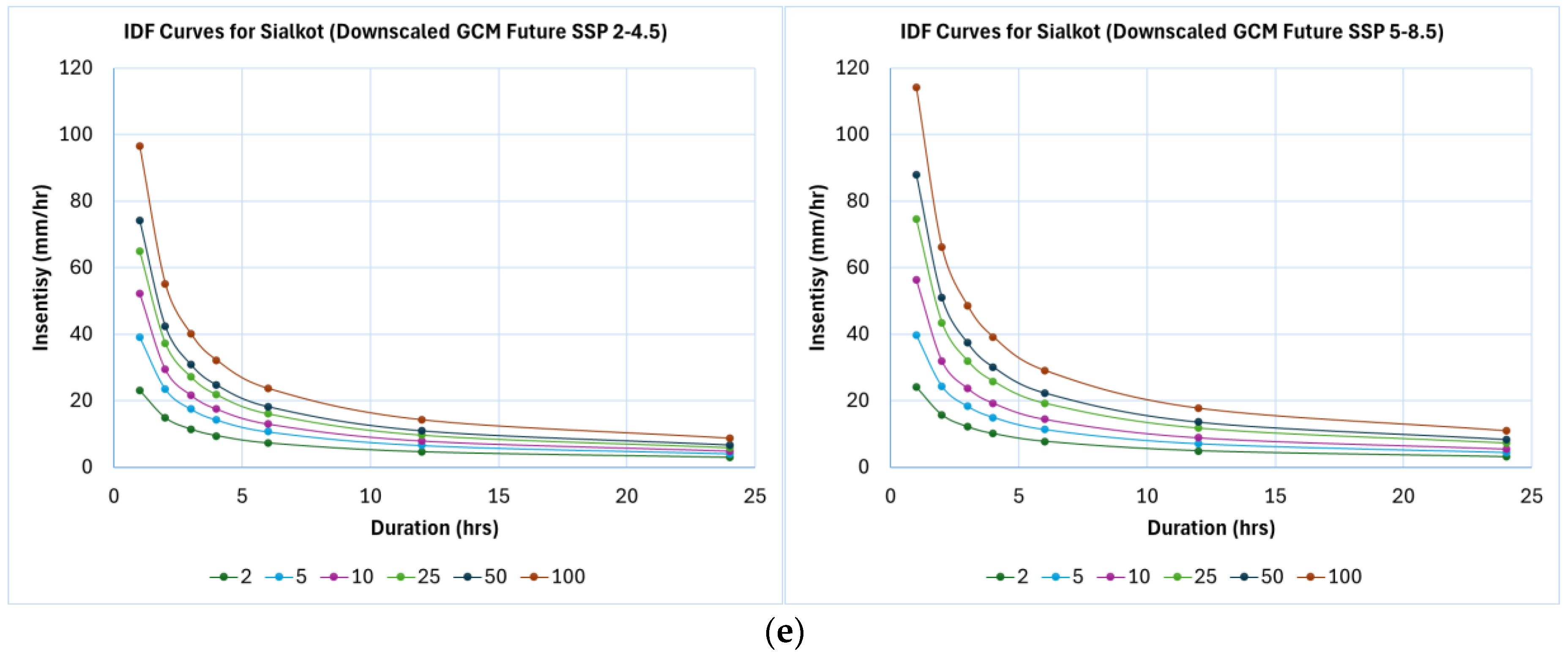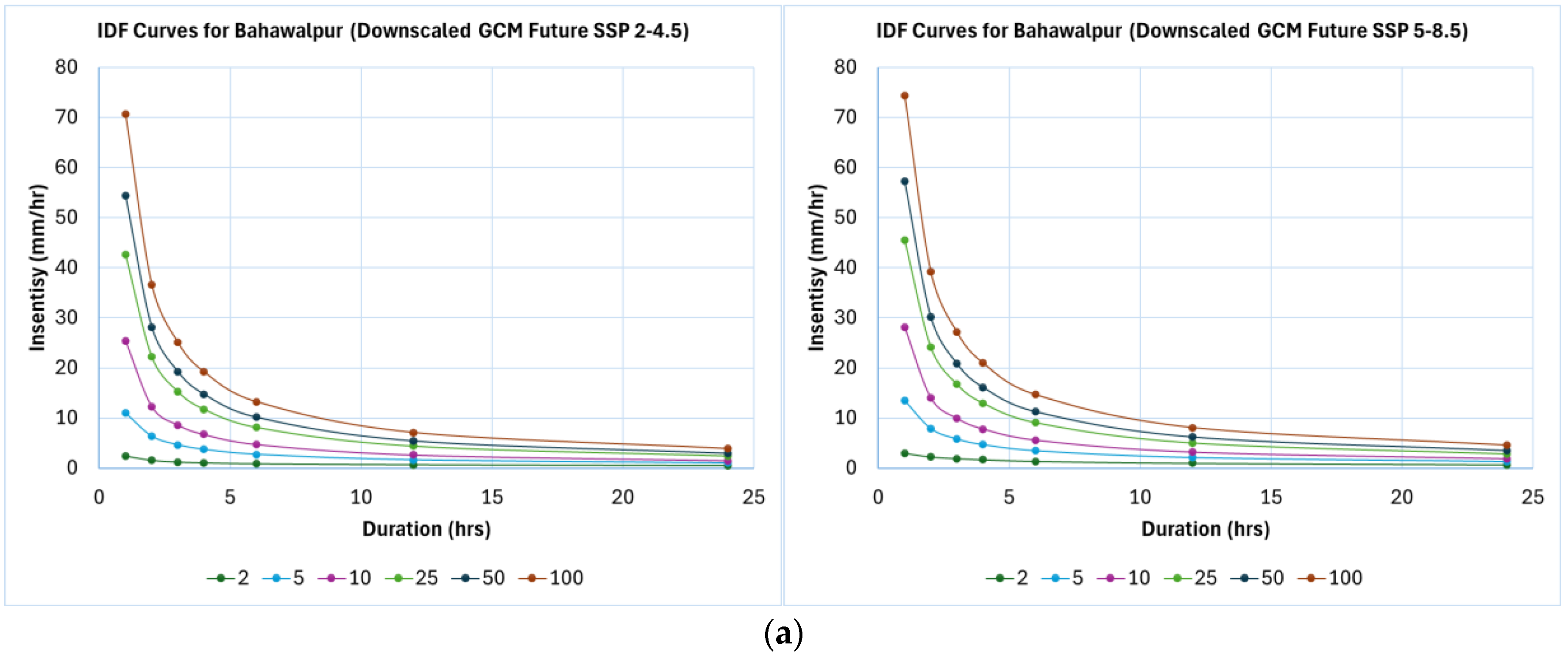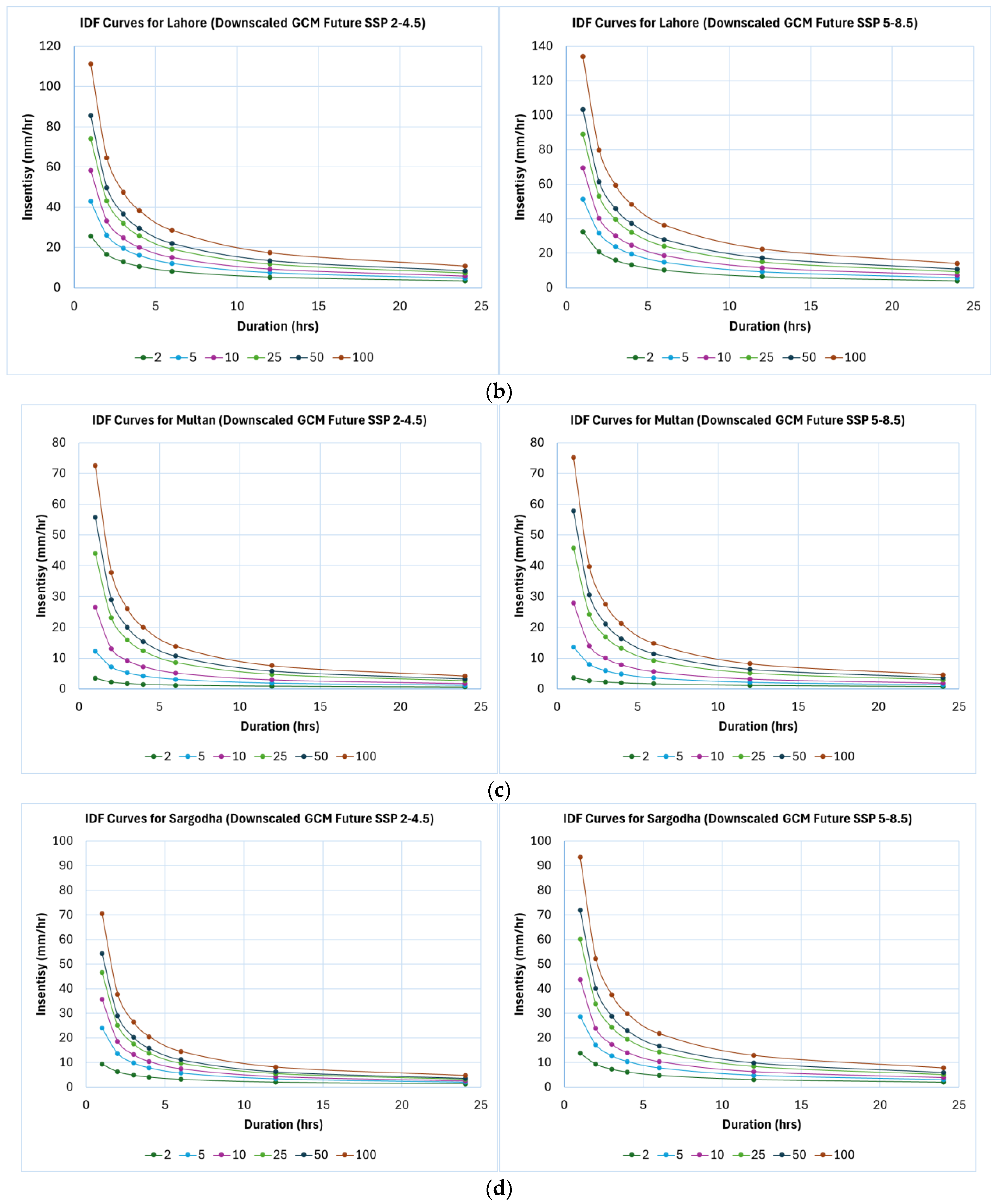 - SSP5-8.5 shows a higher percentage change than SSP2-4.5 across rainfall durations. Bahawalpur’s 50-year return period intensity increases by 95.72% under SSP2-4.5, and Lahore’s by 26.23%.