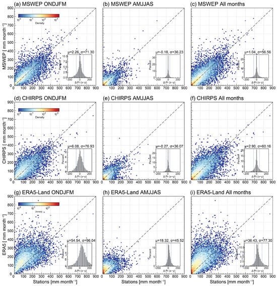 MSWEP exhibited low overall bias, with slight overestimation during ONDJFM ( = 2.26 mm month−1, Figure 2a), near-zero bias during AMJJAS ( = −0.18 mm month−1, Figure 2b), and a very slight overestimation for the full year ( = 1.04 mm month−1, Figure 2c). Precision varied seasonally, being lower in ONDJFM ( = 71.30 mm month−1, Figure 2a), when precipitation magnitudes are higher and convective activity is enhanced []. In contrast, residual variability was lower in AMJJAS ( = 36.23 mm month−1, Figure 2b), consistent with drier winter conditions. The annual aggregate showed intermediate precision ( = 56.56 mm month−1, Figure 2c), indicating partial compensation between seasonal differences.