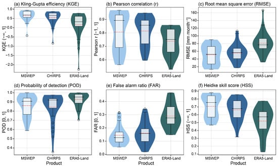 Continuous and categorical metric performance comparison of MSWEP, CHIRPS, and ERA5-Land precipitation products across Bolivia. Violin plots show the distribution of (a) Kling–Gupta Efficiency (KGE), (b) Pearson correlation coefficient, (c) Root Mean Square Error (RMSE), (d) Probability of Detection (POD), (e) False Alarm Ratio (FAR), and (f) Heidke Skill Score (HSS) across 27 weather stations. Black solid lines indicate medians, red dashed lines show means, and white boxes represent interquartile ranges. Higher values indicate better performance for KGE, correlation, POD, and HSS, while lower values are preferred for RMSE and FAR. Except for the RMSE, the x-axis for dimensionless metrics (KGE, r, POD, FAR, and HSS) shows the metric [min, max].