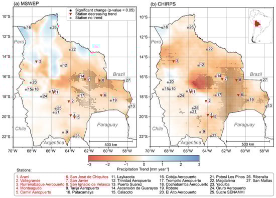 Restricting the analysis to statistically significant pixels (p < 0.05 with AR(1) correction) revealed a more robust pattern of precipitation change (Figure 5). The Llanos showed the highest decline in precipitation, with MSWEP indicating a median decrease of −0.87 mm year−1 (IQR: −1.00 to −0.76 mm year−1) over 55,900 km2, and CHIRPS registering a decline of −1.01 mm year−1 (IQR: −1.20 to −0.89 mm year−1) over 103,175 km2. Evidence for precipitation decline in the Llanos is also corroborated by the weather stations’ trend in Figure 5. The Chaco also showed high agreement between products, with MSWEP (median decline of −0.46 mm year−1, IQR: −0.48 to −0.44 mm year−1) and CHIRPS (median decline of −0.76 mm year−1, IQR: −0.83 to −0.67 mm year−1). In the remaining regions, significant changes were very localized (Figure 5 and Table 3).