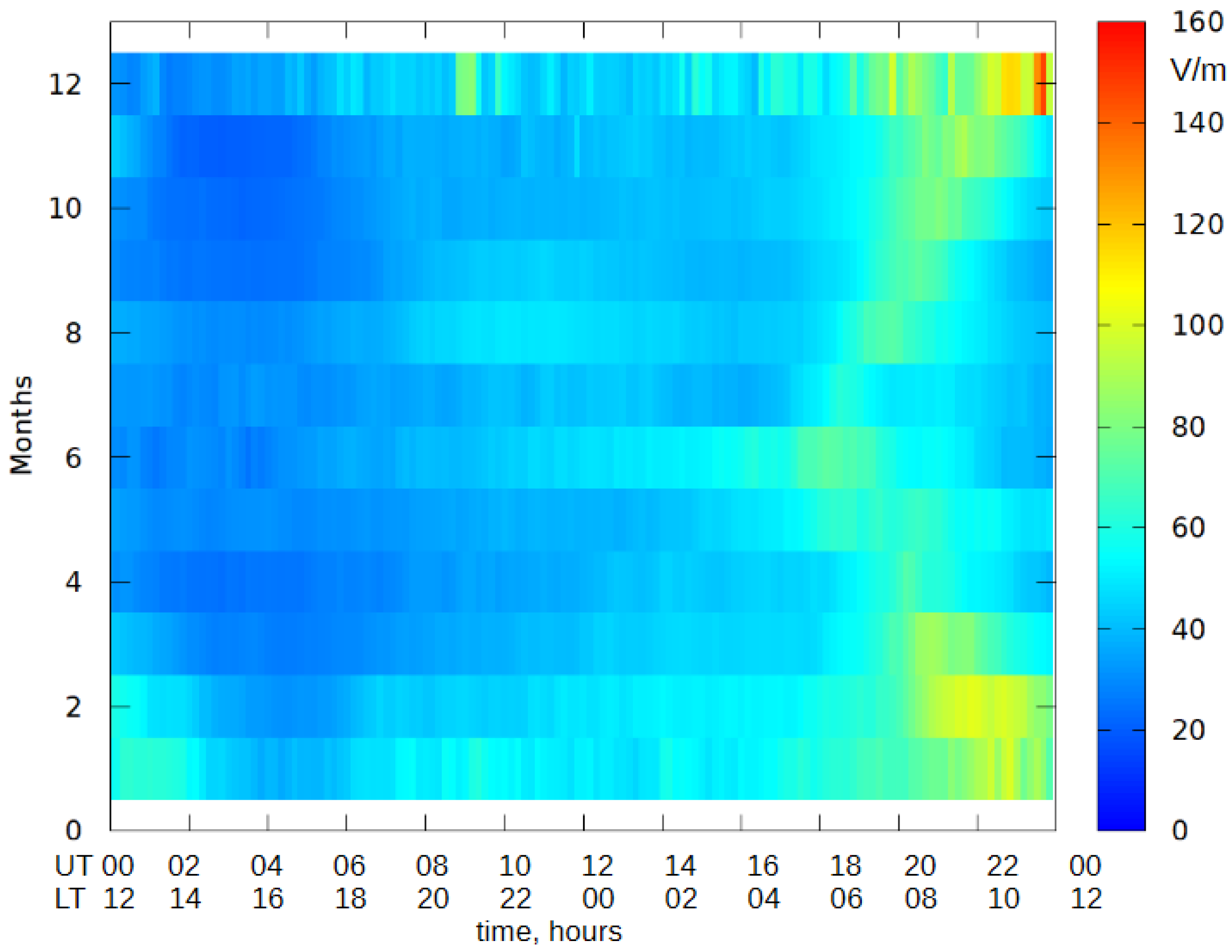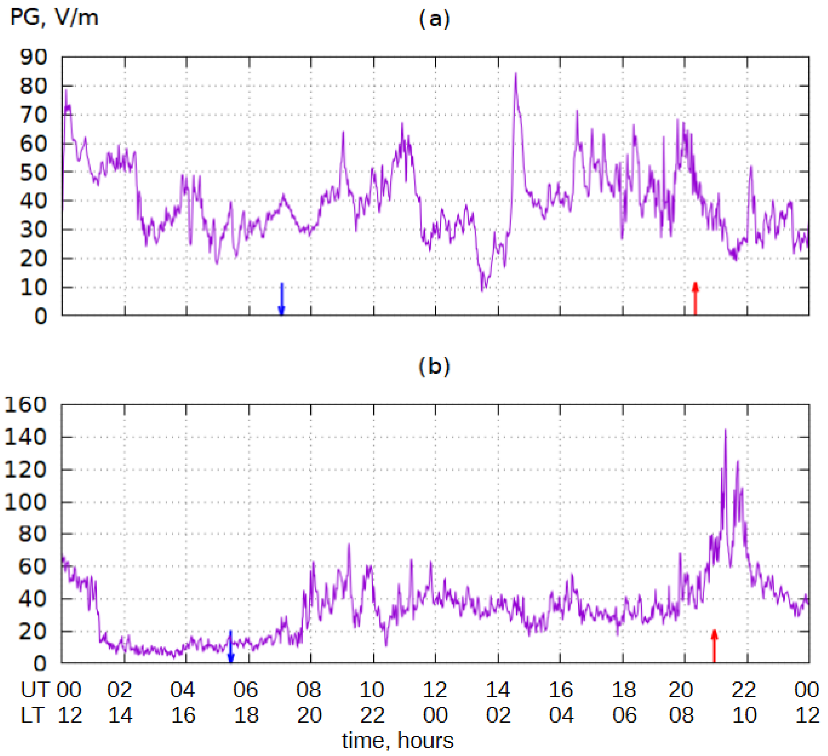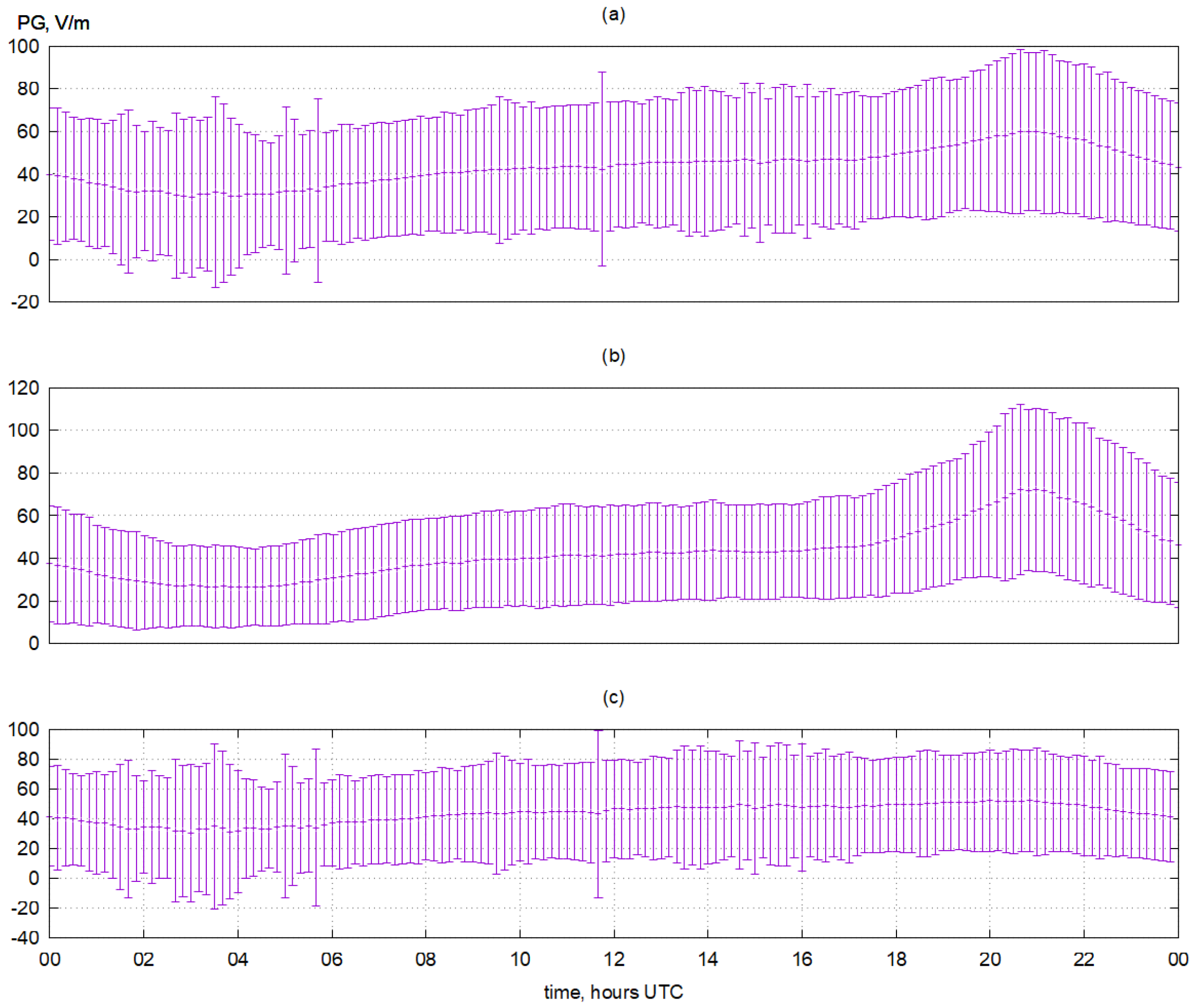 - Tacza, J.; Raulin, J.-P.; Morales, C.A.; Macotela, E.; Marun, A.; Fernandez, G. Analysis of long-term potential gradient variations measured in the Argentinian Andes. Atmos. Res. 2021, 248, 105200. [Google Scholar] [CrossRef]