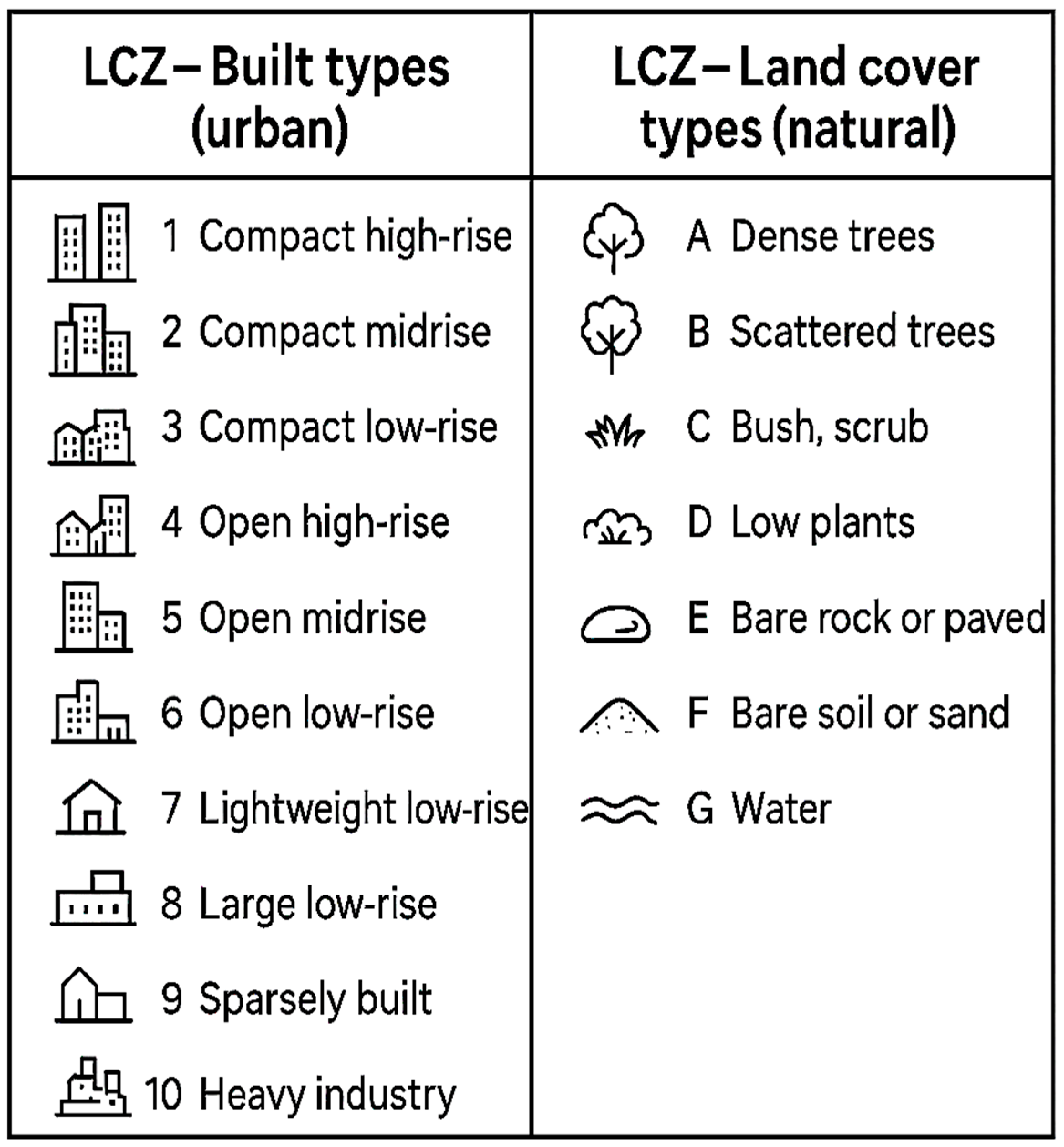 - Han, J.; Mo, N.; Cai, J.; Ouyang, L.; Liu, Z. Advancing the Local Climate Zone Framework: Challenges and Opportunities. Humanit. Soc. Sci. Commun. 2024, 11, 538. [Google Scholar] [CrossRef]
