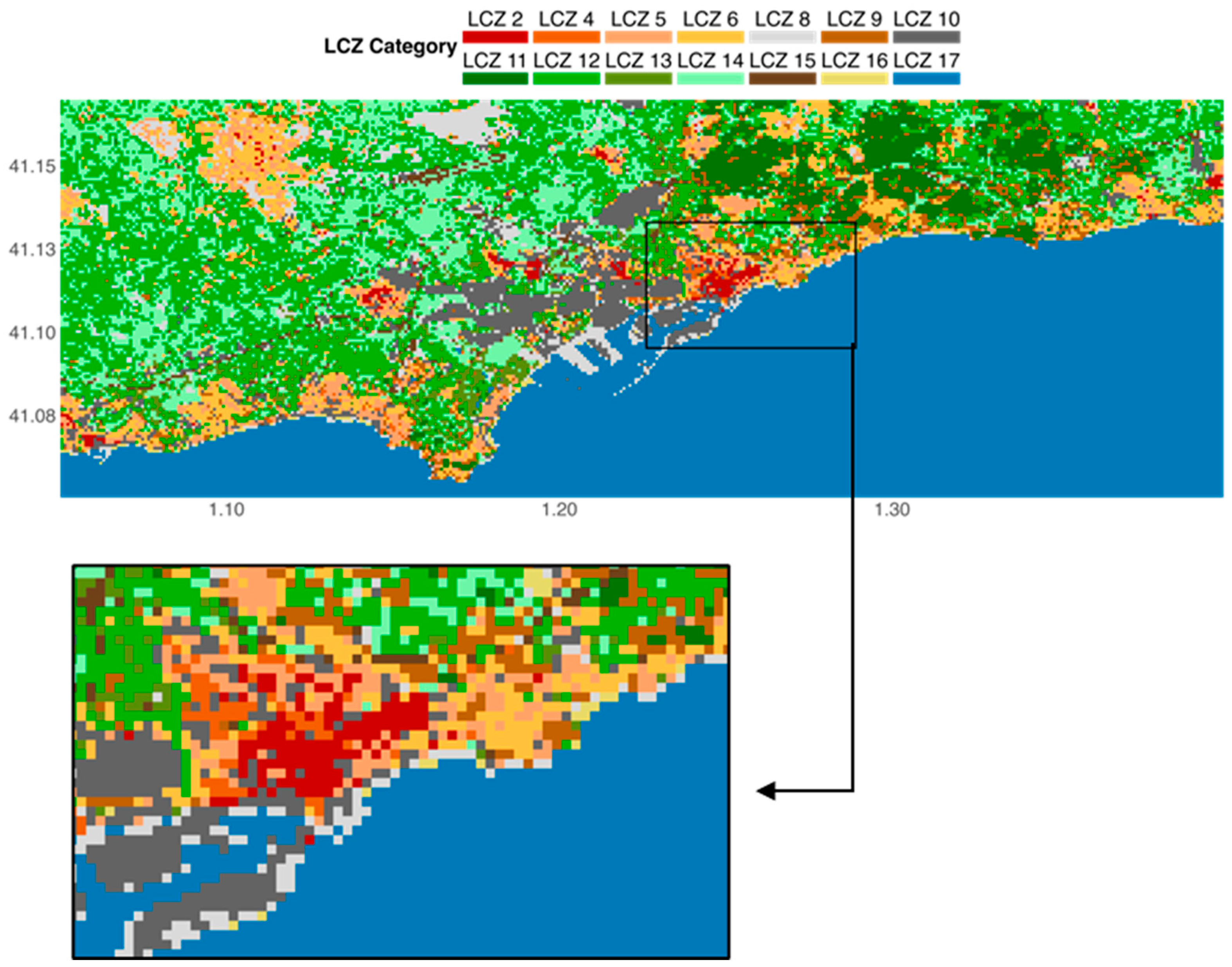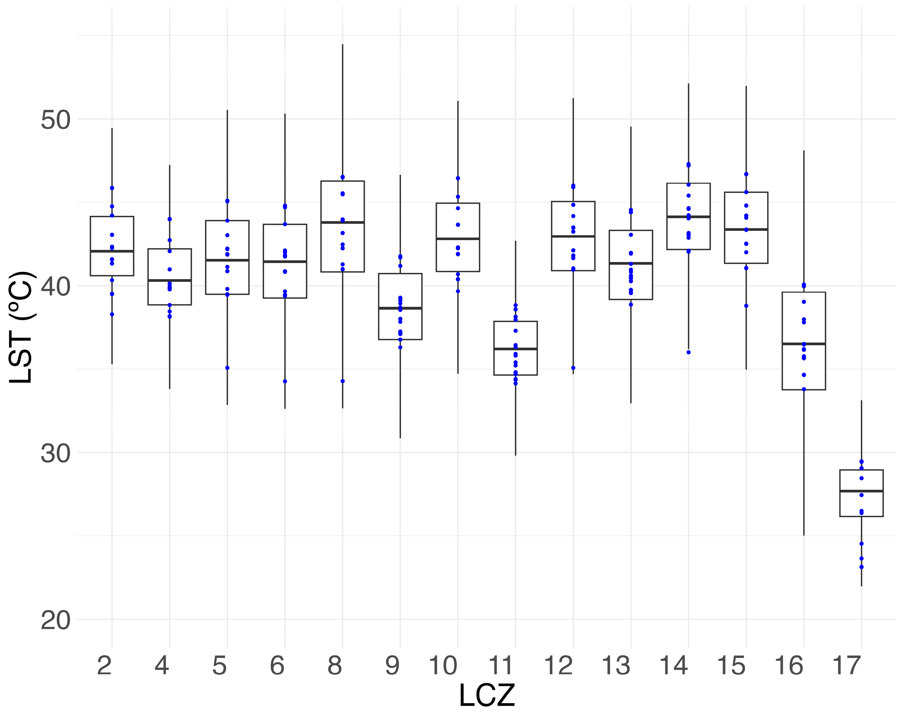- Gilabert, J.; Deluca, A.; Lauwaet, D.; Ballester, J.; Corbera, J.; Carmen Llasat, M. Assessing Heat Exposure to Extreme Temperatures in Urban Areas Using the Local Climate Zone Classification. Nat. Hazards Earth Syst. Sci. 2021, 21, 375–391. [Google Scholar] [CrossRef]