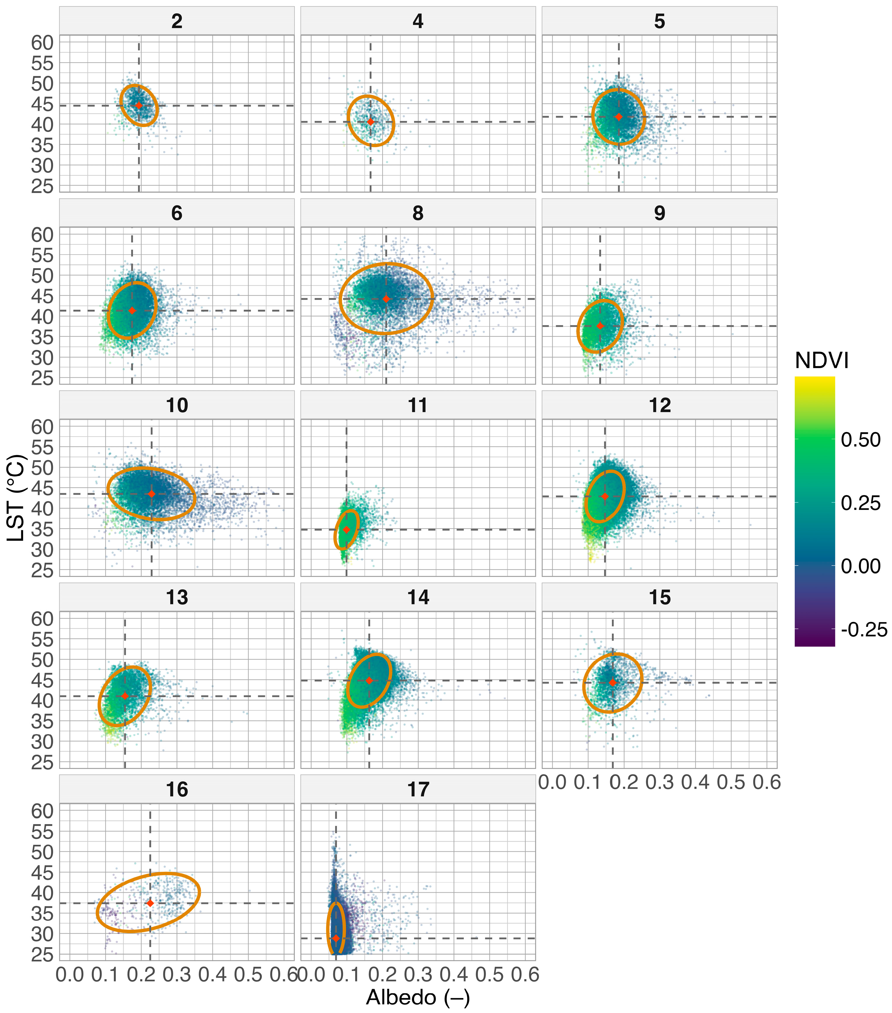 - NDVI-Albedo: Vegetation modifies the relationship between LST and albedo. Vegetated areas, which typically have moderate to low albedo, tend to be cooler, whereas bare soils, with higher albedo, reach higher temperatures in the absence of vegetation.