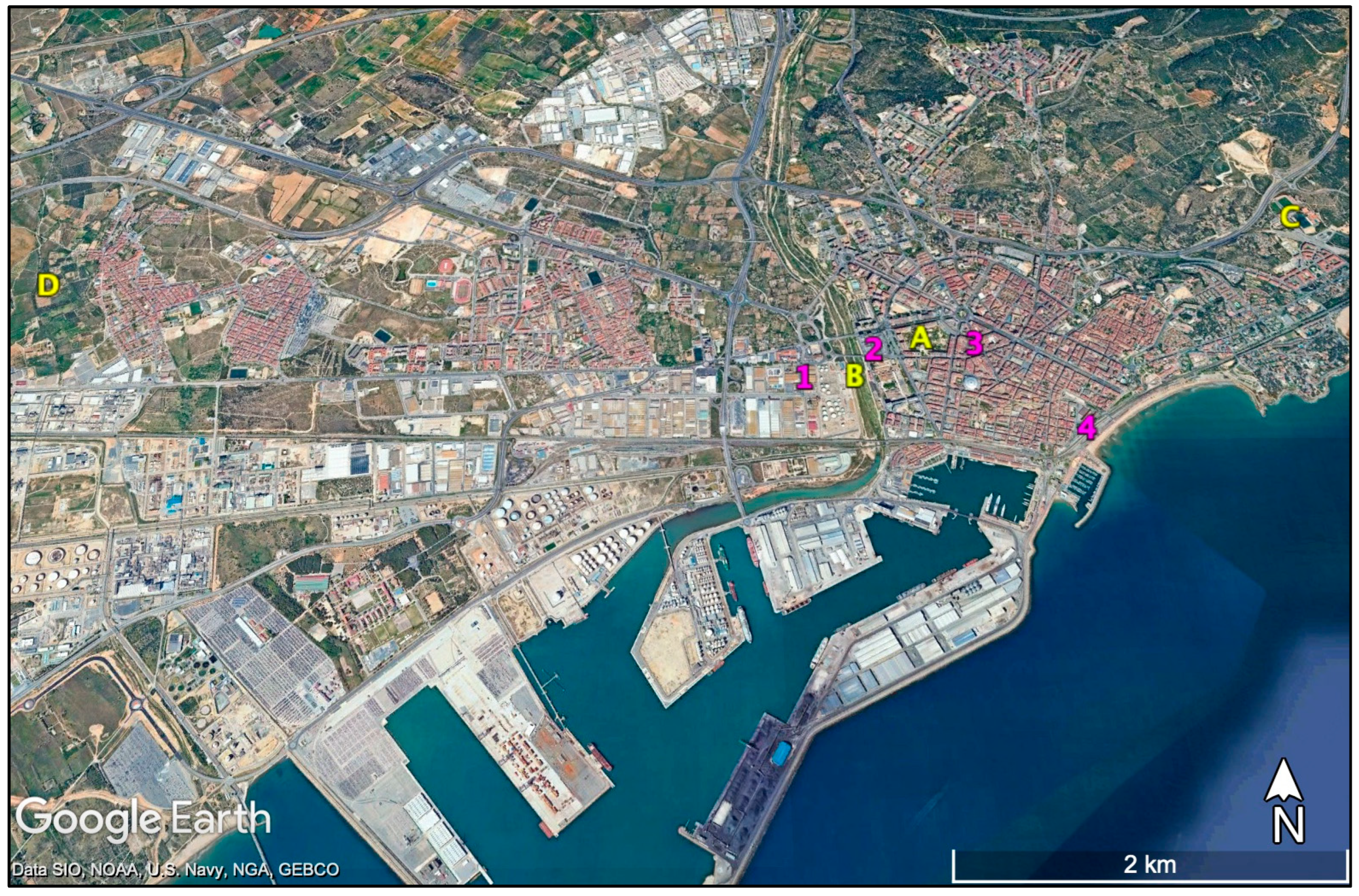 - Letters (A–D) correspond to the sites displayed in Figure 8, representing green and non-urban areas: (A) City park, (B) Linear park, (C) Rural area, and (D) Football stadium.