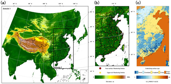 Sketch map of the study area: (a) the two-layer nested domains and the terrain elevation (m); (b) the distribution of near-surface and upper-air monitoring stations within domain 2; (c) the spatial distribution of underlying surface types, with the color bar indicating the corresponding LU_INDEX value.