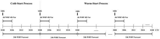 This experiment is designed as a day-cycled analysis and forecasting scheme, as illustrated in Figure 2. Each day begins with a 6-h WRF 4D-Var assimilation window from 00:00 to 06:00 UTC, which assimilates all available observations to produce an optimized analysis field valid at 00:00 UTC. This analysis serves as the deterministic initial condition to drive the standard WRF model for a 24-h forecast. The output (wrfout) constitutes the final simulation result for that day. Except for the initial run, the system employs a “warm-start” mechanism for cyclic coupling: the previous day’s 24-h forecast results serve as the first guess for the current day’s assimilation process. This “6-h analysis to 24-h forecast” cycle repeats daily throughout the one-month simulation period.