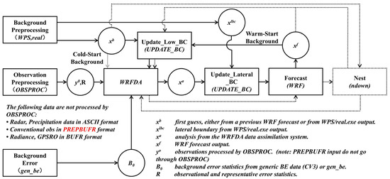 - Barker, D.; Huang, X.-Y.; Liu, Z.; Auligné, T.; Zhang, X.; Rugg, S.; Ajjaji, R.; Bourgeois, A.; Bray, J.; Chen, Y.; et al. The Weather Research and Forecasting Model’s Community Variational/Ensemble Data Assimilation System: WRFDA. Bull. Amer. Meteor. Soc. 2012, 93, 831–843. [Google Scholar] [CrossRef]