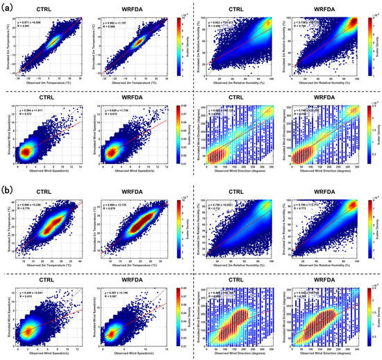 Figure 4 shows the observed–simulated scatter density plots of meteorological variables for (a) February and (b) June, representing winter and summer, respectively. The figure uses color to represent the density distribution of data points within specific regions. The dashed black line (1:1 reference line) and solid red line (linear regression fit) are employed to assess system bias. The results indicate that temperature field forecasts were significantly improved after the introduction of data assimilation. In winter, the correlation coefficient for the T2 increased from 0.941 to 0.968, and the regression slope rose from 0.971 to 0.982, reflecting better simulation-observation and reduced systematic bias. In summer, the improvement in T2 was more pronounced, with the correlation coefficient increasing by 13.3%; the high-density core region, previously located below the reference line (indicating overestimation), shifted back toward the reference line, indicating a strong constraint of the assimilation system on the summer temperature field.