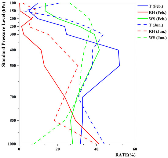 Improvement rate (RATE, %) for meteorological variables at different standard pressure levels (hPa) (solid lines represent February 2019; dashed lines represent June 2019; curves with the same color correspond to the same variable).
