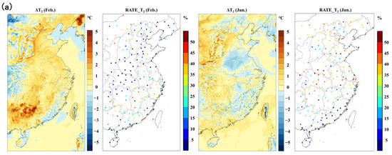 Figure 7b depicts the variation in 2 m relative humidity within the background field. In February, the increment field predominantly exhibits consistent negative values, indicating that assimilation has implemented a correction to the background field characterized by ‘dehumidification’ at the monthly mean level. The corresponding RATE distribution map reveals that improvements in relative humidity forecasts are primarily concentrated in the central and southern parts of the study region, with enhancement rates generally reaching 20–50%. By contrast, the June relative humidity adjustments exhibit markedly different characteristics. The intensity of negative increments has diminished, and their spatial distribution has become more complex.