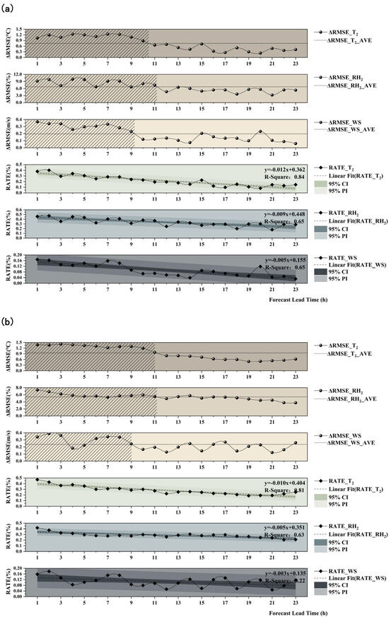 Evolution of assimilation benefits with forecast lead time in (a) February and (b) June 2019. In each panel, the upper three subplots display the ΔRMSE for T2, RH2, and WS10 (the horizontal dashed line denotes the mean ΔRMSE over 23-h forecast lead times for the corresponding variable; the shaded area marks the forecast period during which ΔRMSE exceeds its mean); the lower three subplots present the corresponding improvement rate (RATE, %) and the results of the linear regression analysis, overlaid with its linear regression fit (dashed line), the 95% confidence interval (dark shading) and the 95% prediction interval (light shading).